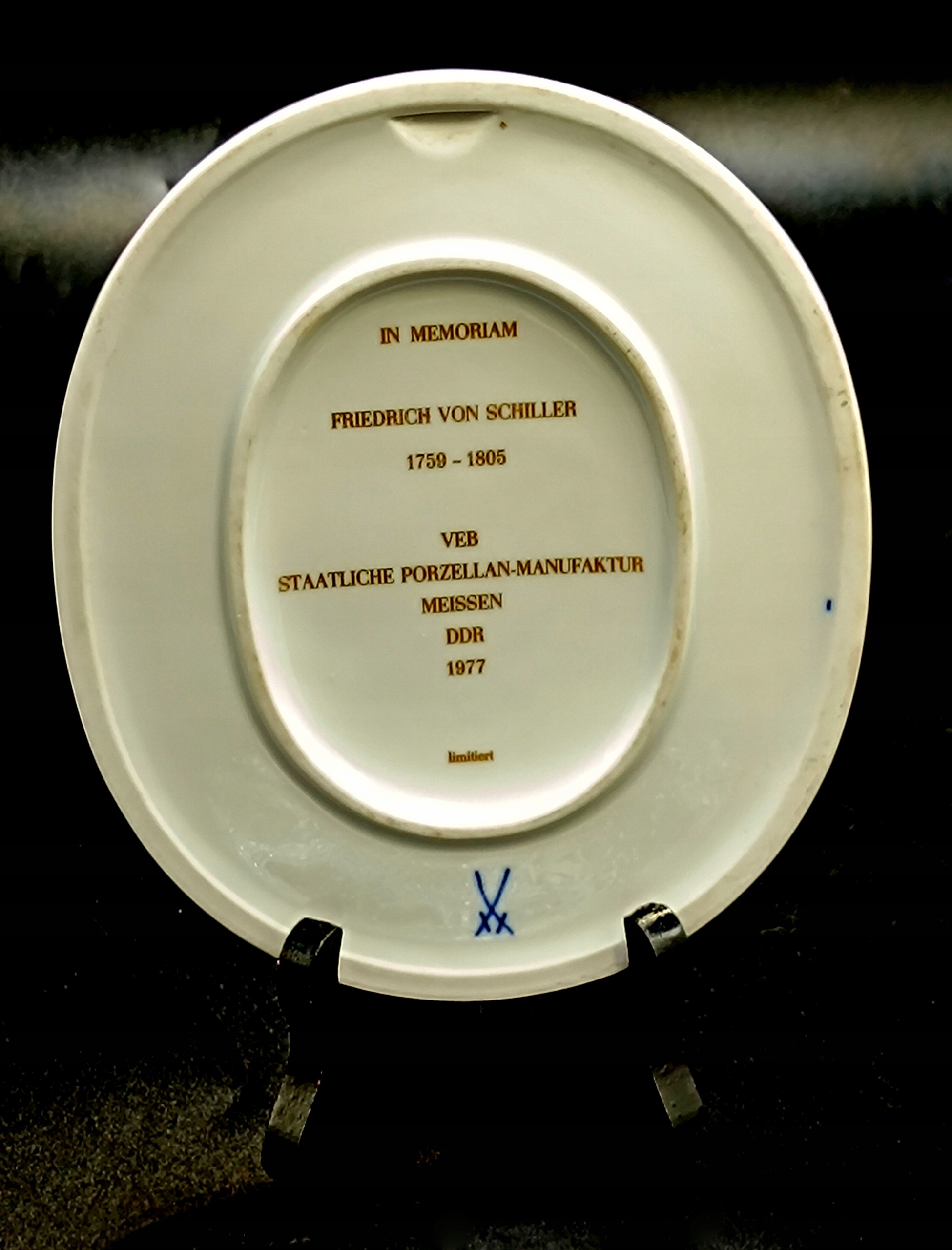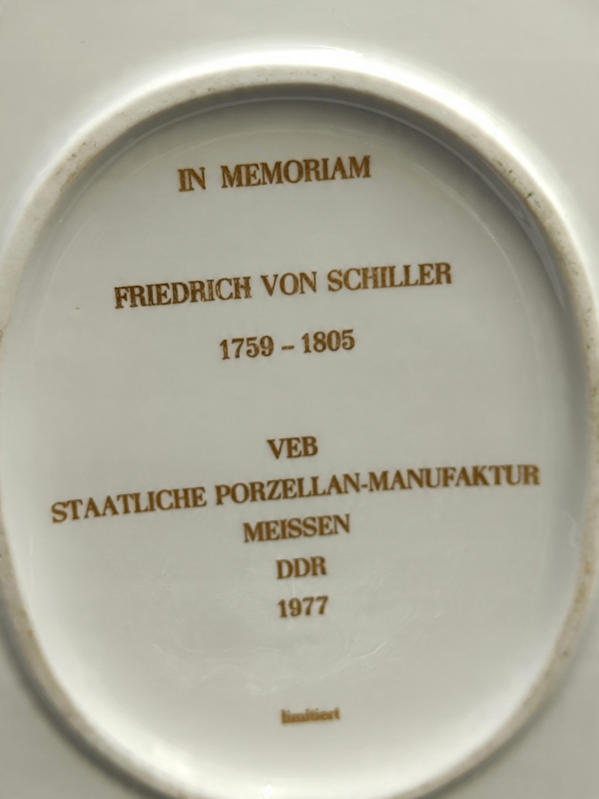 Овальний медальйон вироблявся в обмеженій версії в пам'яті померлого Фрідріха фон Шиллера. Він був німецьким поетом, філософом, істориком, естетикою, теоретичним театром та драматургом, представником так -зведеної Веймарської класики, а також автором відомої Оди до Радості. Він помер 9 травня 1805 р. Туберкульозу у віці лише 45 років. Він залишив незавершену драму Деметрію і близько 30 ідей для мистецтв, які він мав намір написати, але, на жаль, більше не зробив.