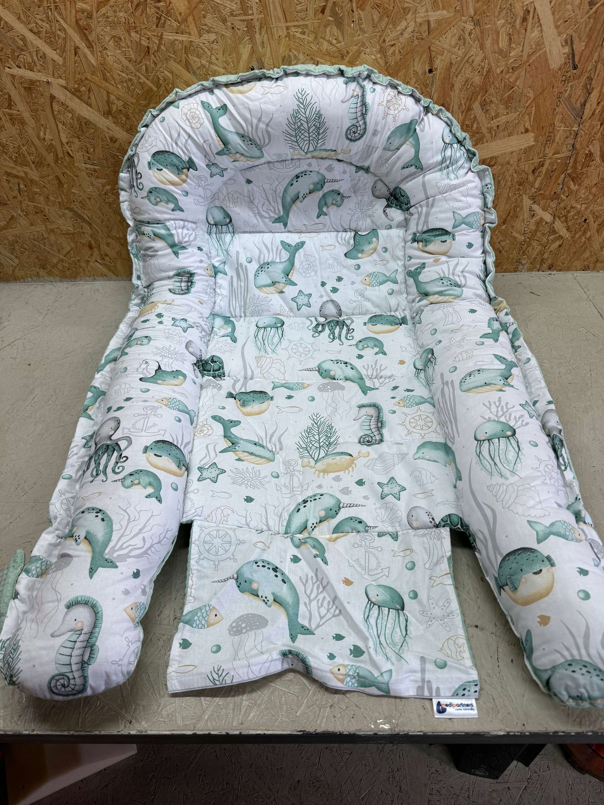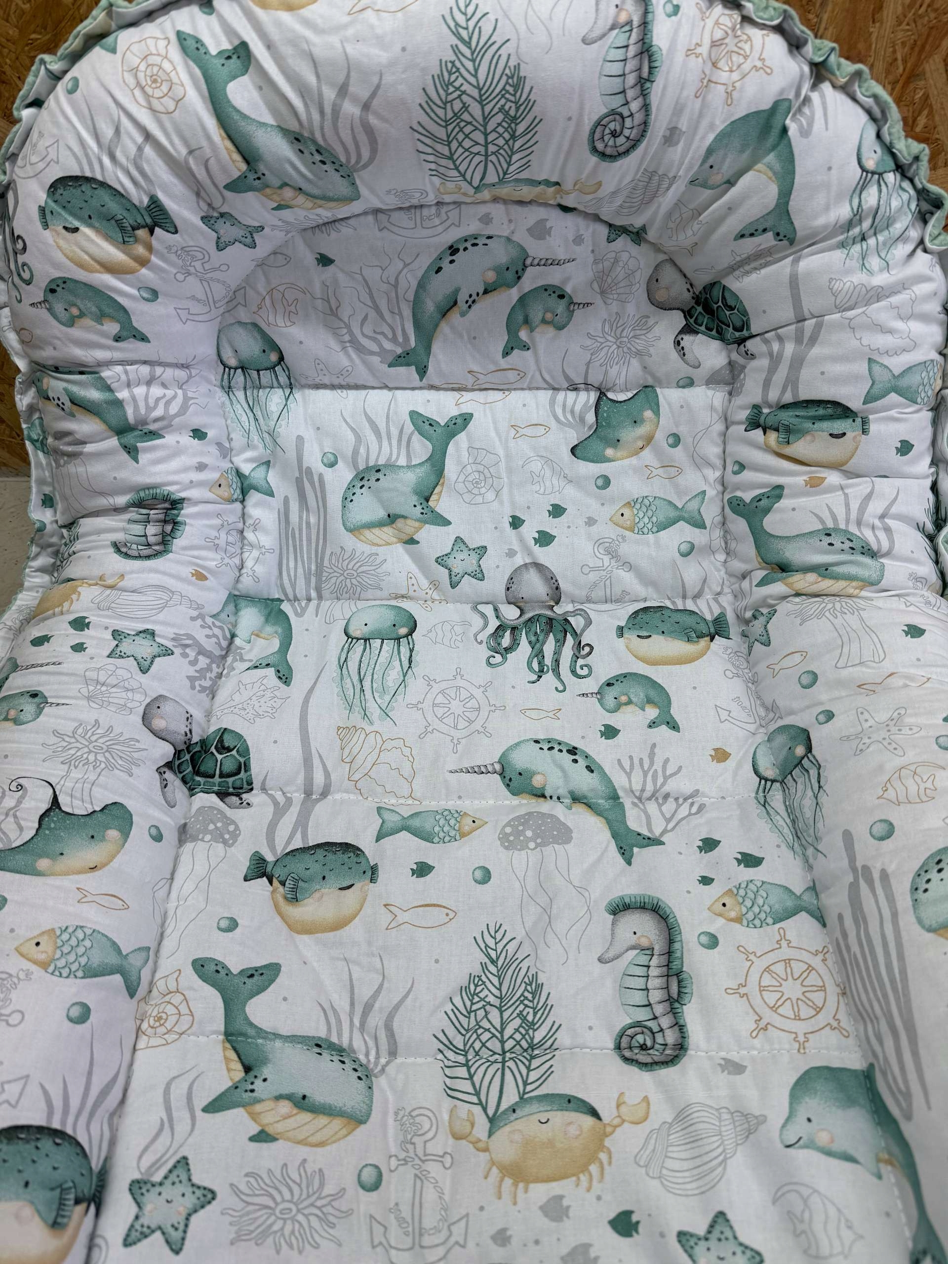 Двосторонній кокон 100% бавовна Зовнішні розміри: 100 см х 60 см х 15 см Розміри поверхні: 70 см х 35 см Використані матеріали: - 100% бавовна, щільність 125 г/м2 - 100% поліестер - гіпоалергенна силіконова кулька - наповнення по краях кокон - 100% поліестер - вата 300 г/м2 - наповнення дна кокона. Усі використані матеріали сертифіковані OEKO-TEX STANDARD 100 Спосіб використання: прання при 30°, делікатна програма, віджимання до 800 віджимів, прасування бавовняної тканини при. температура до 110 градусів С. Використовуйте делікатні пральні засоби, не використовуйте відбілювач, не сушіть в сушарці