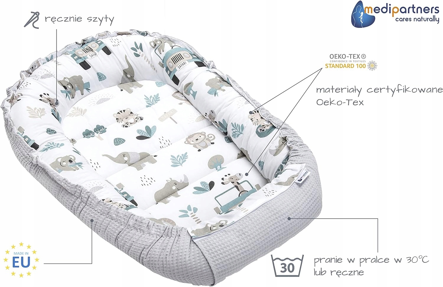Бічні сторони гнізда наповнені гіпоалергенними силіконовими кульками. Підняті краї забезпечують безпеку дитини.