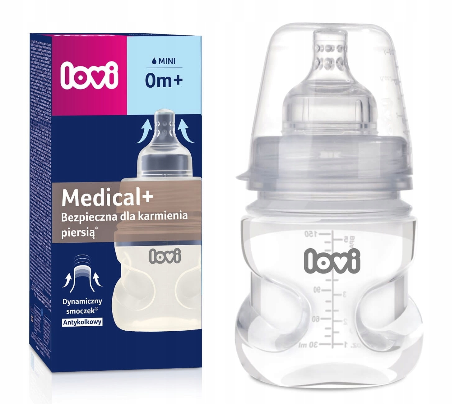 Пляшка Medical+ 150 мл була розроблена та протестована під медичним наглядом. (89% лікарів не помітили труднощів при поєднанні природного вигодовування з вигодовуванням з пляшечки LOVI, 88% лікарів підтвердили збереження ритму смоктання у дитини на грудному вигодовуванні. Дослідження проводилося в 2007 році як юзабіліті на основі опитування спеціалістів під медичним наглядом в амбулаторних умовах 607 дітей грудного віку за участю лікарів, акушерок та батьків.)