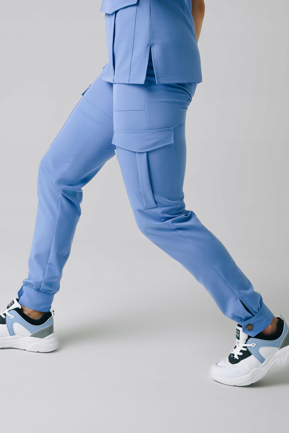Бруси медичні з текучий, чотиристоронній гнучкий матеріал. Поперек розташований розтяжна гума, прошита в трьох місцях, щоб не порвалася і не порвалася виворот. Є дві накладні кишені спереду і дві з боків бойові кишені, що застібаються ззовні на невидиму застібку. Нижня частина штанів ми завершили манжетом з еполетом і кокосовим ґудзиком. Кокосові кнопки які ми використовували, водостійкі та не фарбуються. Щоб зробити все якомога простіше Вставляючи ніжку, ми використовували тріщину, яка закінчується болтом. Штани в тон Етна