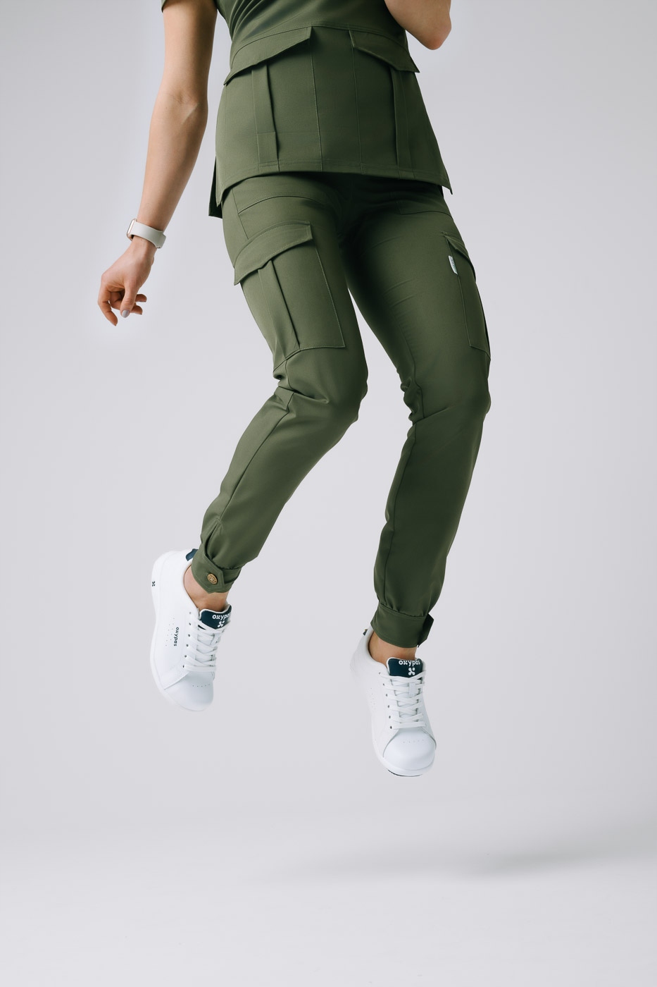Бруси медичні з текучий, чотиристоронній гнучкий матеріал. Поперек розташований розтяжна гума, прошита в трьох місцях, щоб не порвалася і не порвалася виворот. Є дві накладні кишені спереду і дві з боків бойові кишені, що застібаються ззовні на невидиму застібку. Нижня частина штанів ми завершили манжетом з еполетом і кокосовим ґудзиком. Кокосові кнопки які ми використовували, водостійкі та не фарбуються. Щоб зробити все якомога простіше Вставляючи ніжку, ми використовували тріщину, яка закінчується болтом. Штани в тон Етна