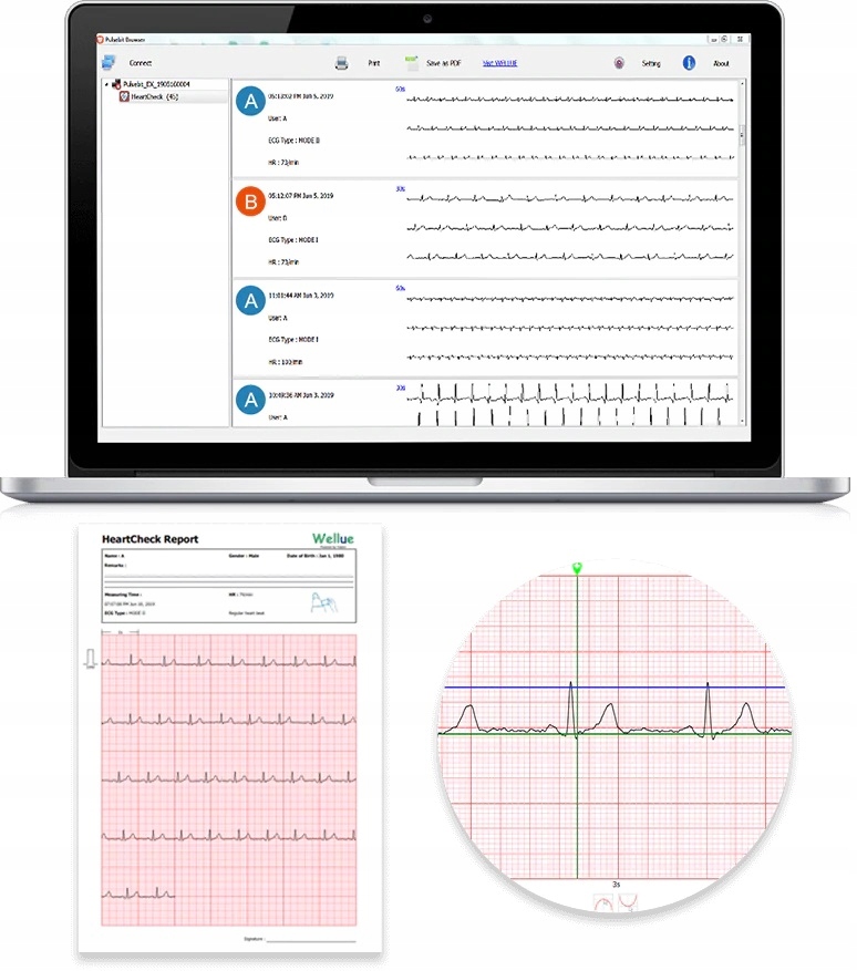 - Надійне та точне виявлення таких аномалій (виникають як нерегулярне серцебиття): аритмія, Передчасне скорочення шлуночків (PVC), фібриляція передсердь (AF), пауза, тахікардія, брадикардія