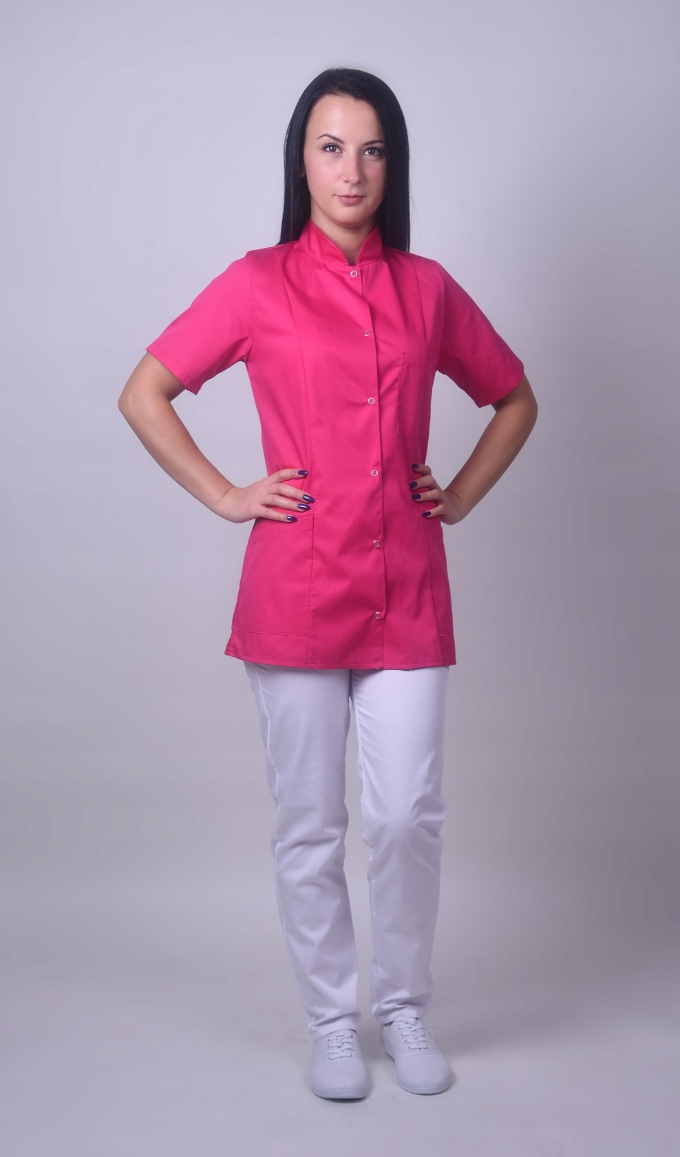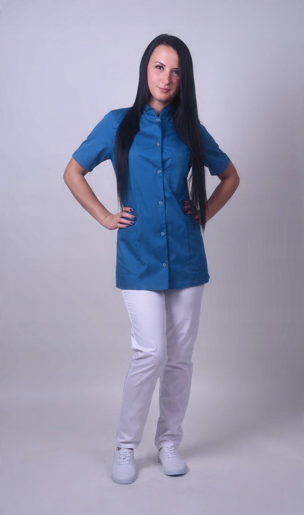Якісна модель з коміром-стійкою та покроєм по фігурі. Використовується в охороні здоров'я, лабораторних заняттях, громадському харчуванні, салонах краси та багатьох інших галузях промисловості.
