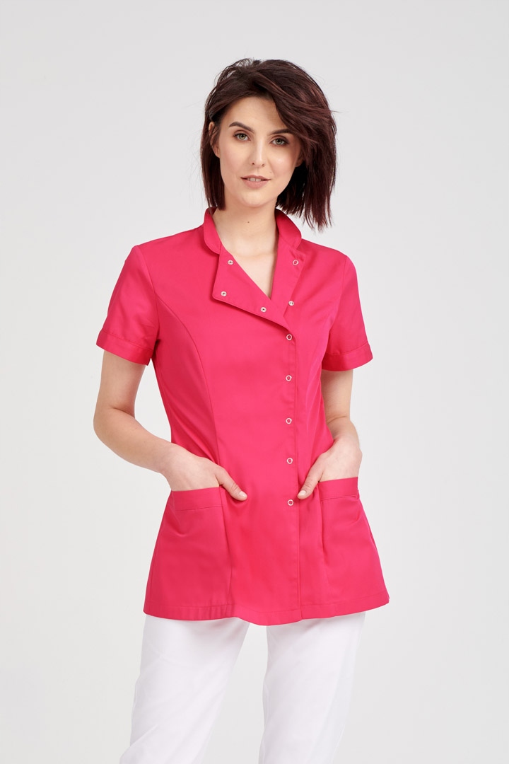 Про товар: Фартух з міцного матеріалу, застібається для знімків. Приталений, приталений крій підкреслює фігуру. Фартух з шортами рукава і комір-стійка. Дві великі кишені, розташовані на передній частині блузи. Класика в сучасне видання.