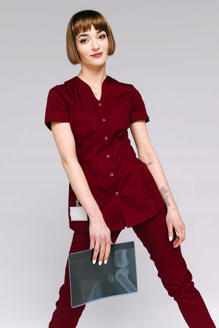 Косметичний фартух Alicja — це вічна форма з коротким рукавом і цікавим коміром-стійкою. Медичний костюм застібається на шию ідеальне рішення для жінок, які цінують комфорт і витонченість. Ніжно Приталений крій ідеально підкреслює жіночу фігуру, додаючи елегантності та вишуканості. Уніформа оброблена декоративною окантовкою, яка додає всьому сучасний стиль застібається надзвичайно зручними та практичними кнопками. Важливо, що модель має практичні кишені, необхідні для повсякденної роботи.