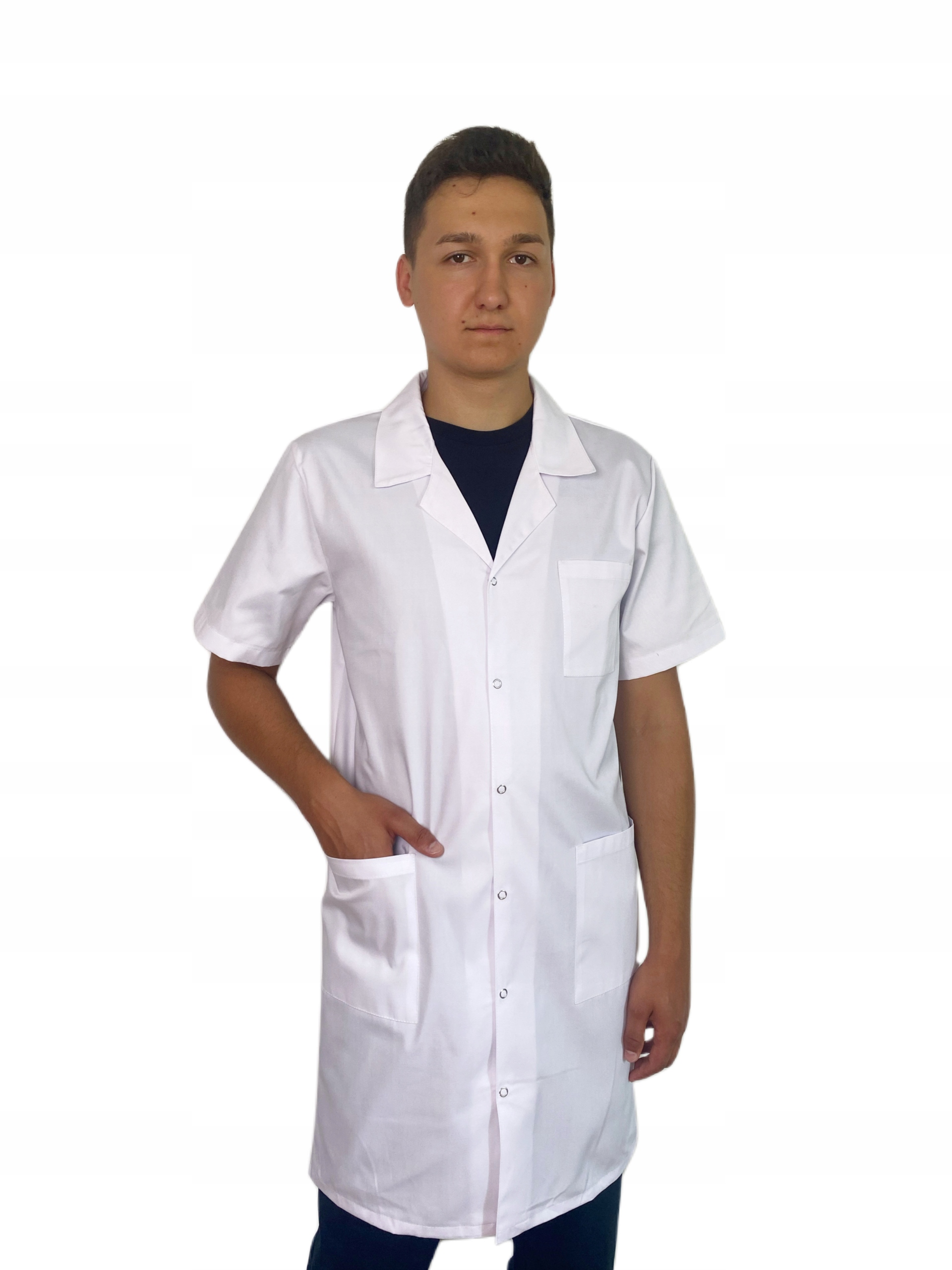 Хіла медичний білого кольору з короткими рукавами, застібається на шість застібок. Дві кишені на рівні стегон і одна на грудях. Ідеально підходить для медичного персоналу та для роботи в різних лабораторних умовах.