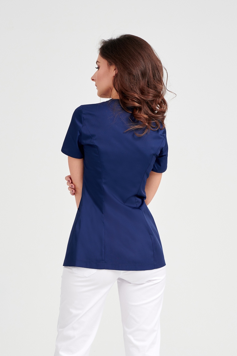 Фартух з міцного матеріалу матеріал кріпиться на застібки. Приталений, приталений крій підкреслює фігуру. Фартух з короткими рукавами та вирізом U. Дві великі кишені розташований на передній частині блузи. Класика в сучасному стилі.