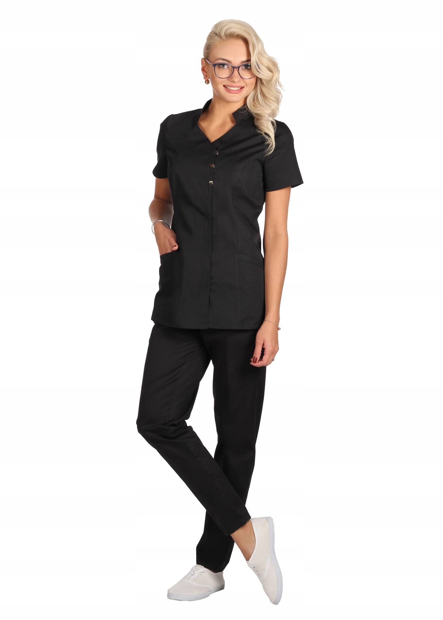 Медична або косметична куртка найкраще поєднується з вузькими брюками. Декоративних застібок 3, решта приховані під вертикальною смужкою для схуднення. Французькі розрізи спереду формують жіночий силует. Дві кишені (тут пропонуємо розмістити логотип компанії або флок.