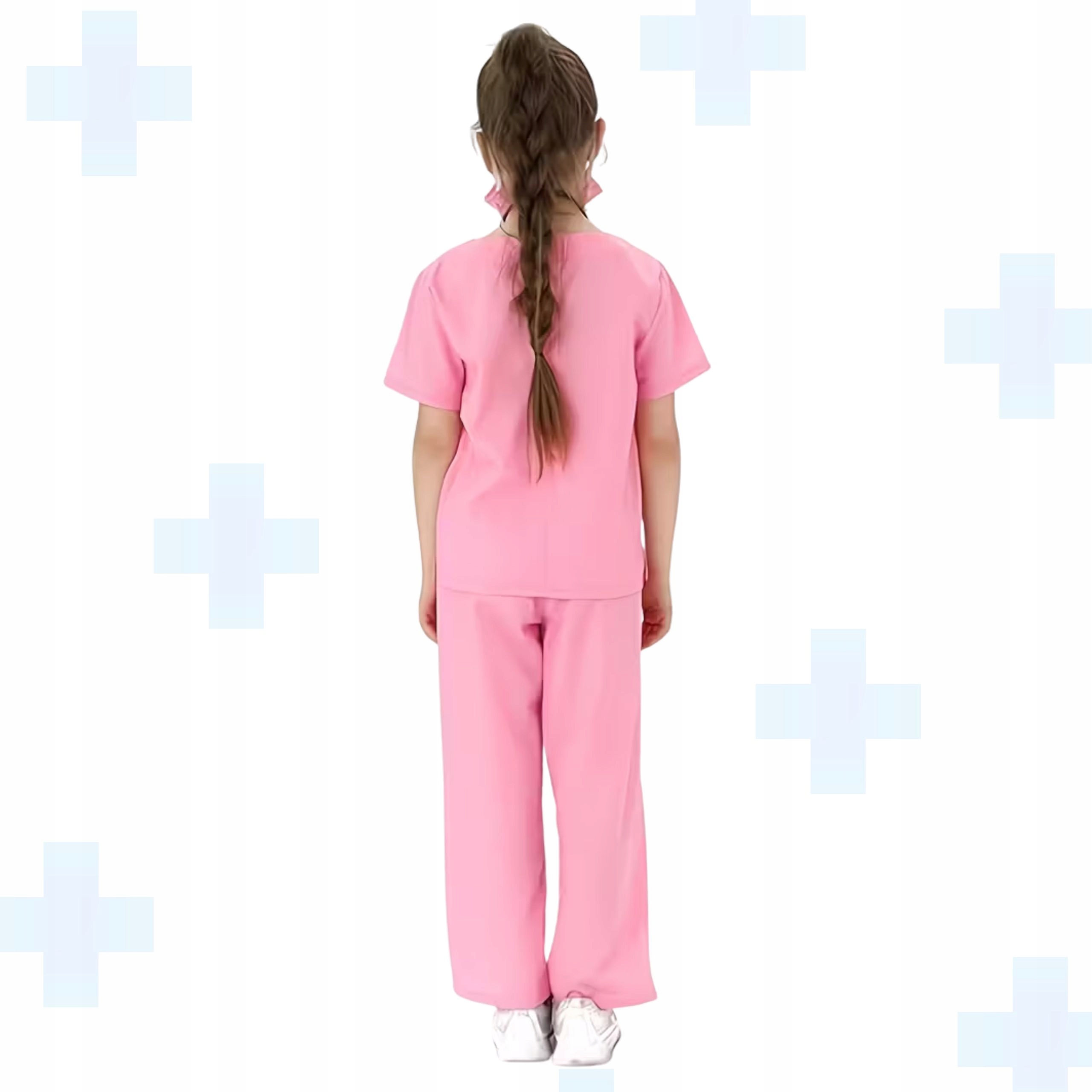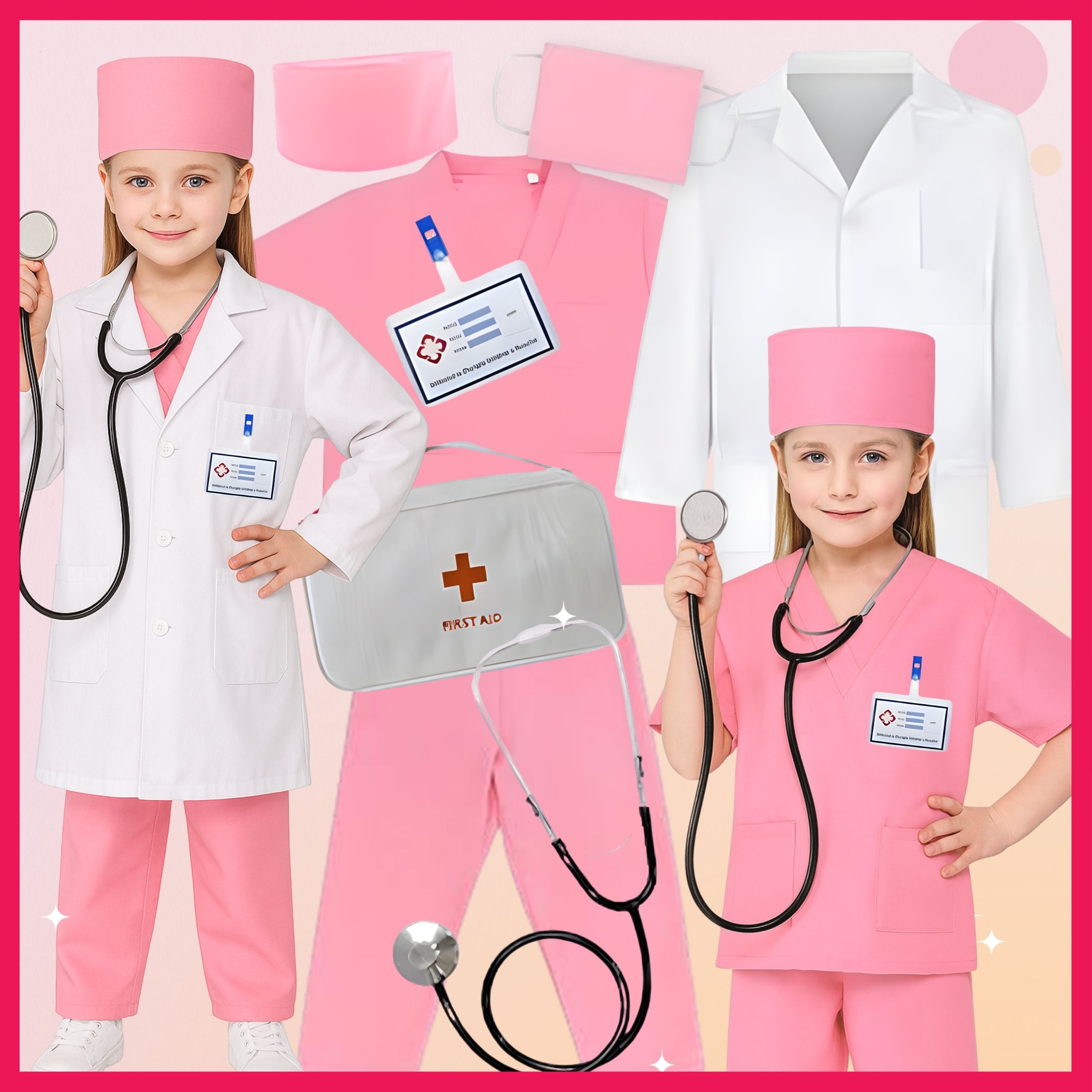 • У набір входить усе необхідне, щоб відчути себе справжнім лікарем — рожевий медичний набір (блузка та штани), білий халат, шапочка та маска.