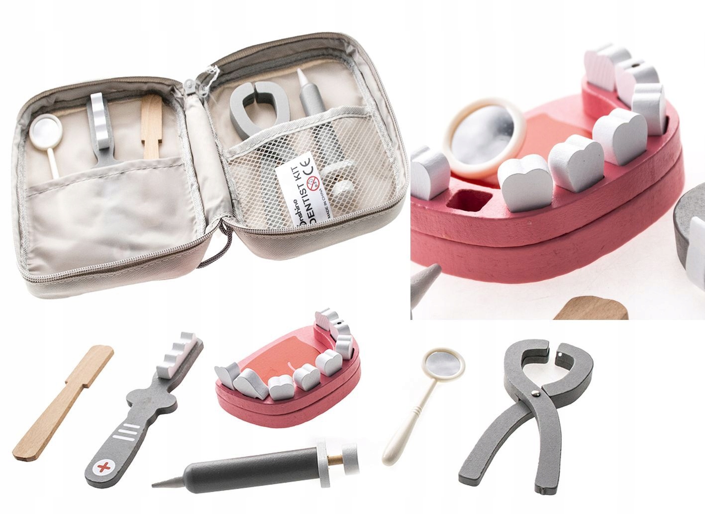 Дерев'яні інструменти для маленького стоматолога. Цей набір містить усе, що потрібно вашому маленькому лікарю, щоб грати в стоматолога. Майбутні лікарі можуть робити уколи, виривати та перевіряти стан зубів своїх пацієнтів. Гра в стоматолога - це не лише одна з рольових ігор, це такожнавчання догляду за гігієною та наслідки її відсутності. Це також вчить емпатії та співчуття, що дуже важливо в соціальних стосунках. Сприяє розвитку уяви та навчає вирішувати проблеми. Така розвага — чудова тренування перед відвідуванням справжнього офісу.