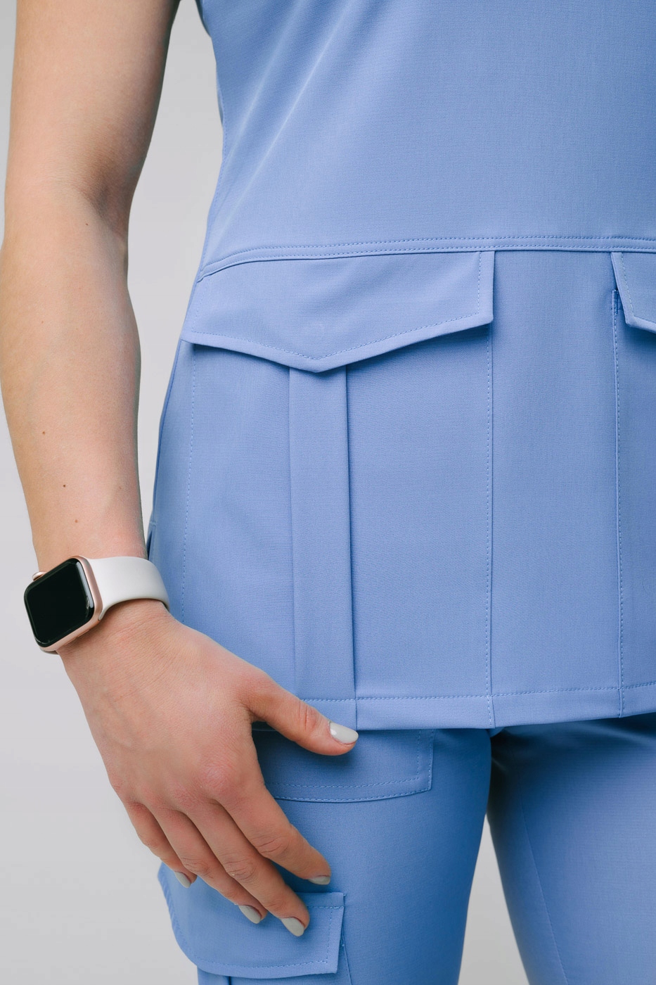 Медичний світшот з струмуючої еластичної резинки в чотирьох напрямках матеріал. Дуже ретельно оброблений V-подібний виріз.На плечах є декоративні еполети з кокосовим ґудзиком. Кокосові кнопки, які ми використовували водостійкий і не залишає плям. Толстовка має дві бойові кишені на застібці для знімків, непомітних ззовні. З боків є тріщини болти підвищують комфорт при носінні. На грудях і на спинці блузка ми використовували дротики для моделювання. Світшот з комплекту Етна.
