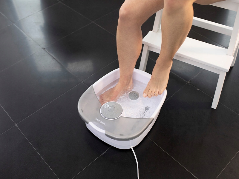 Спеціальна функція: розслабляючий масажер для ніг. 3 в 1: тепла вода, пухирі та вібрації, інтенсивний світловідбиваючий масаж ніг. З дренажом до легкого спорожнення. Підходить для ніг до розміру 44. Автоматичне опалення показує більше