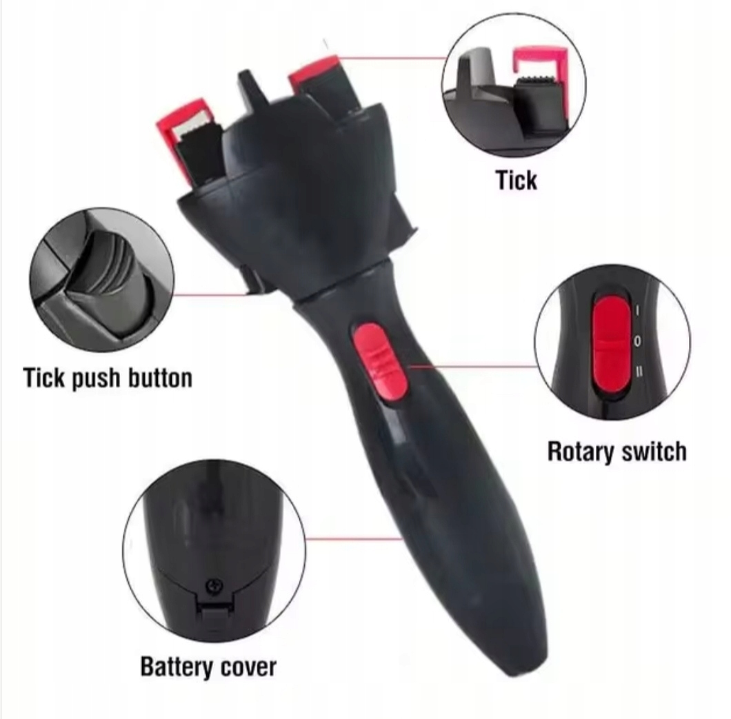 Це так просто - просто закріпіть два шматки волосся в кожну затискач, посуньте перемикач угору, щоб завити волосся, і посуньте його вниз, щоб скрутити разом!