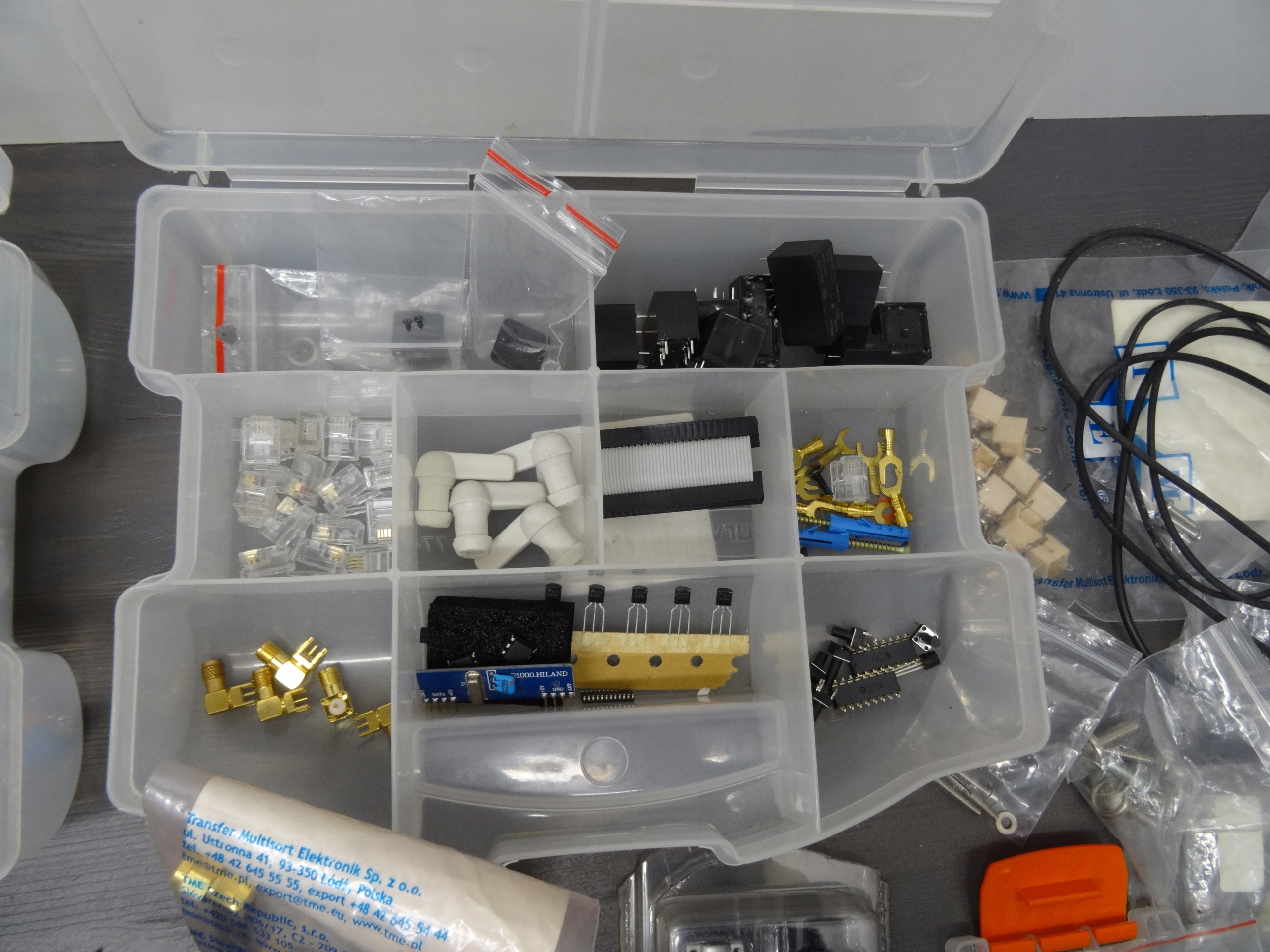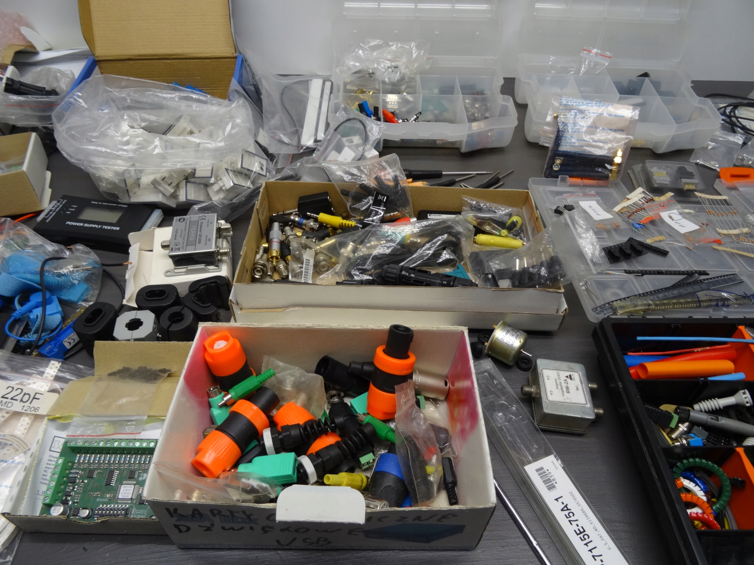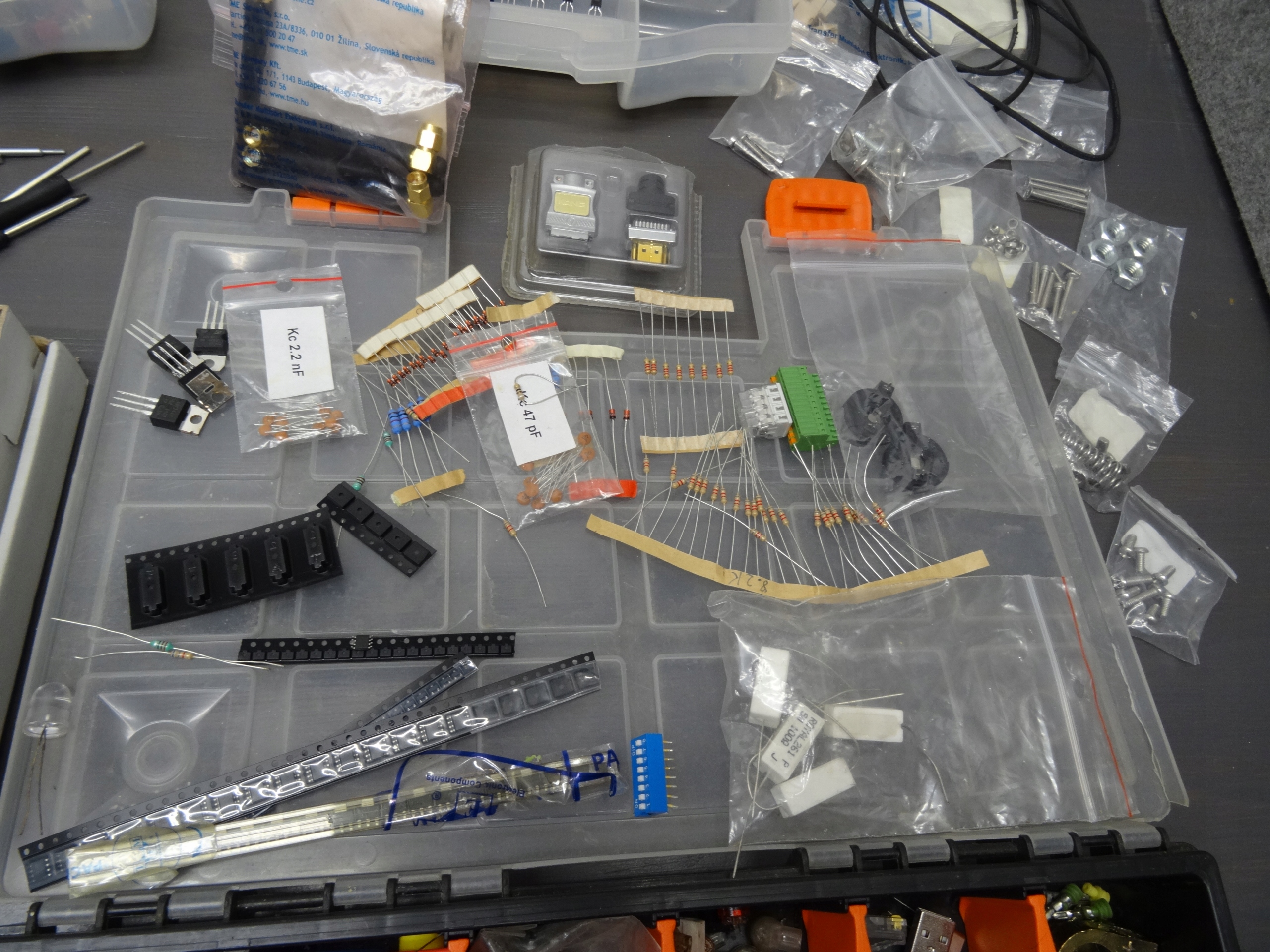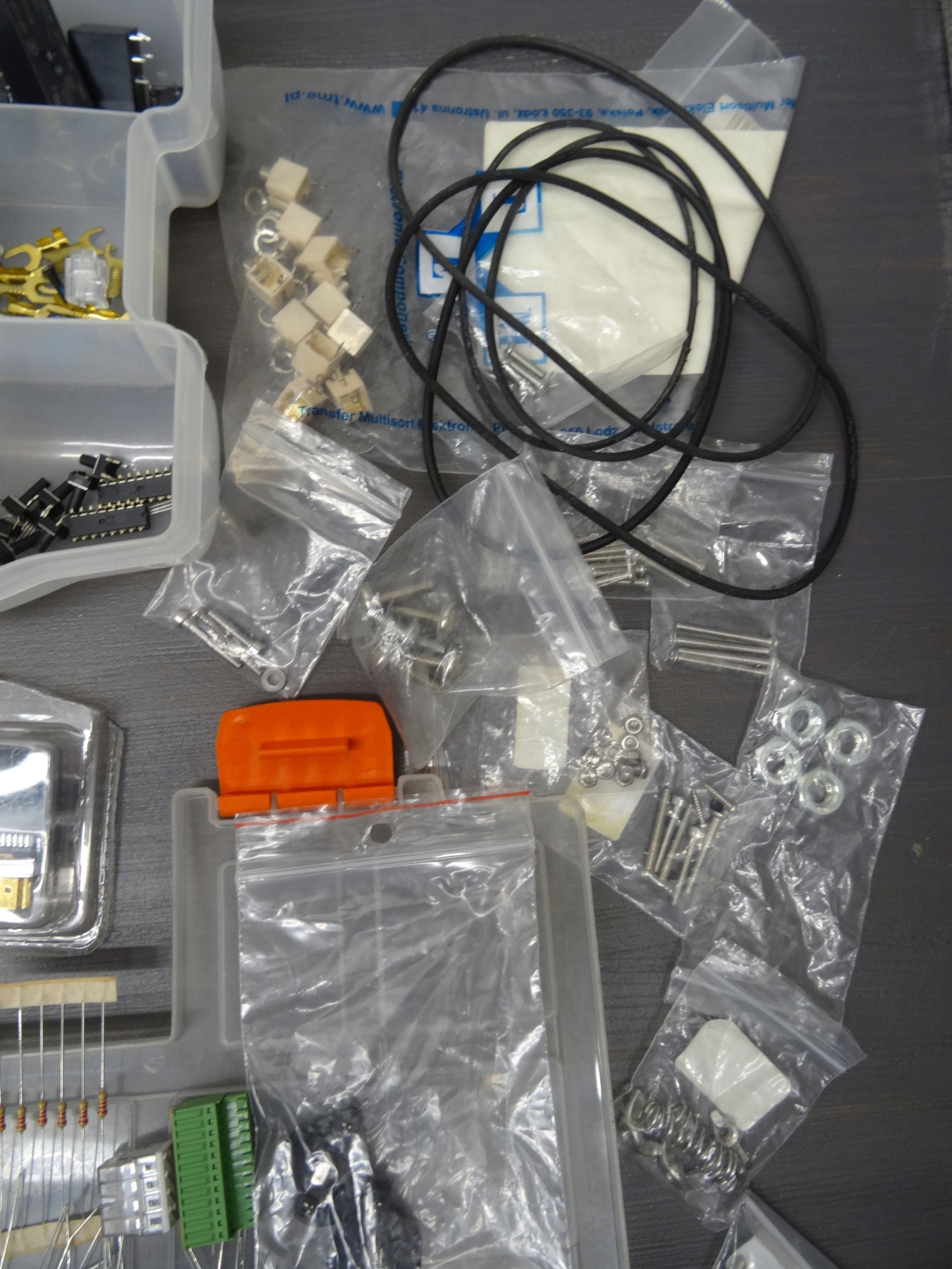 Дуже великий набір різноманітних електронних та електричних частин. В основному невикористані речі. Все запаковано в три валізи-органайзери та картонні коробки. Багато елементів повторюються, наприклад, різні вилки та резистори. Всього кілька сотень елементів.