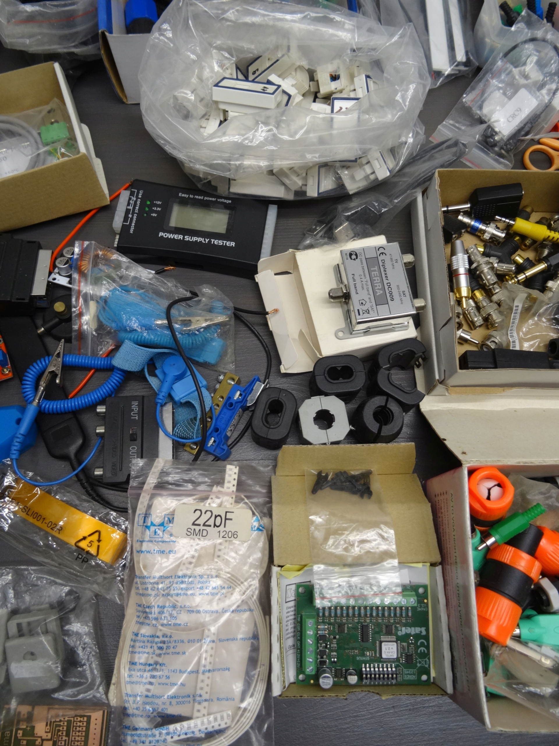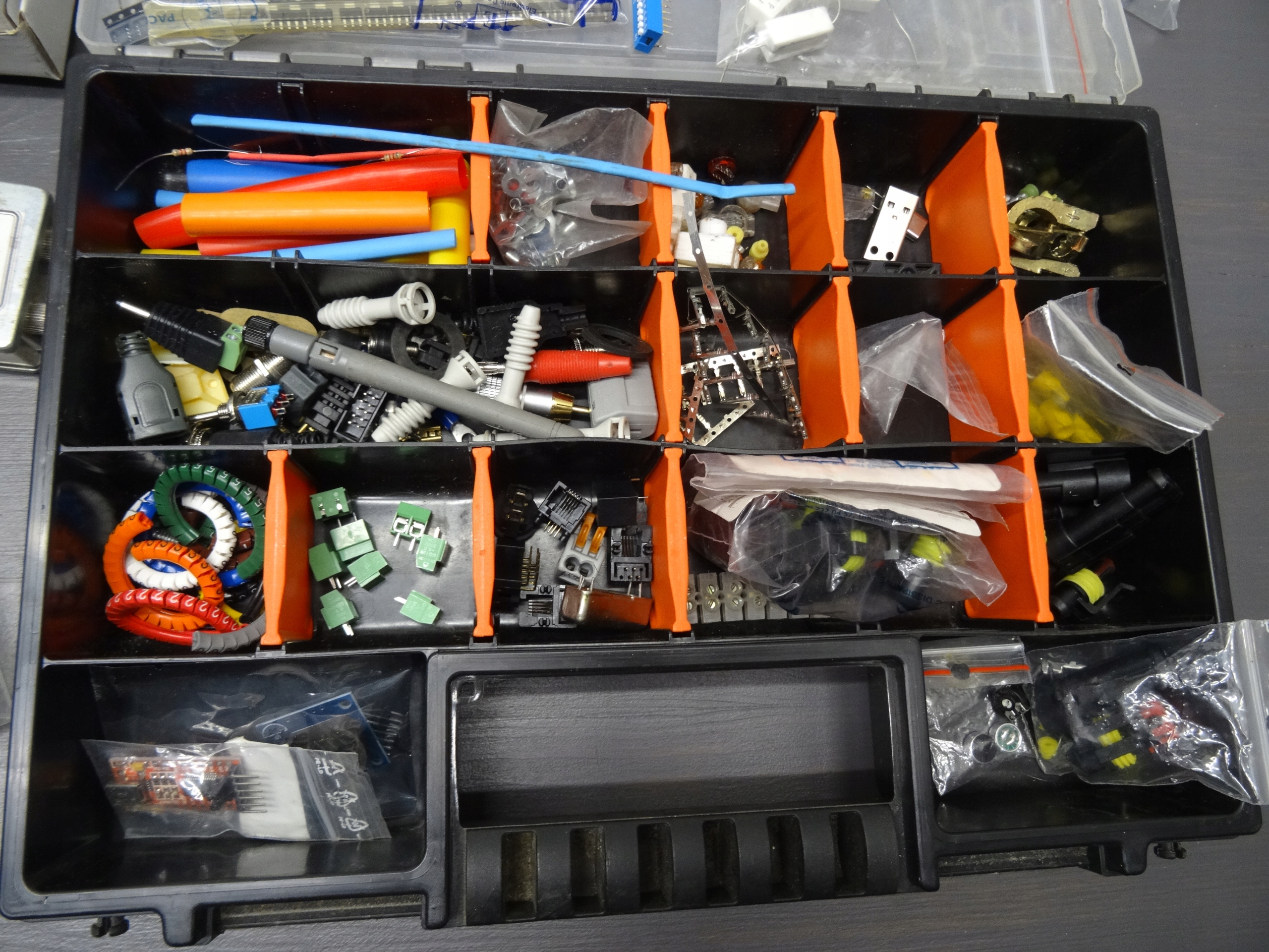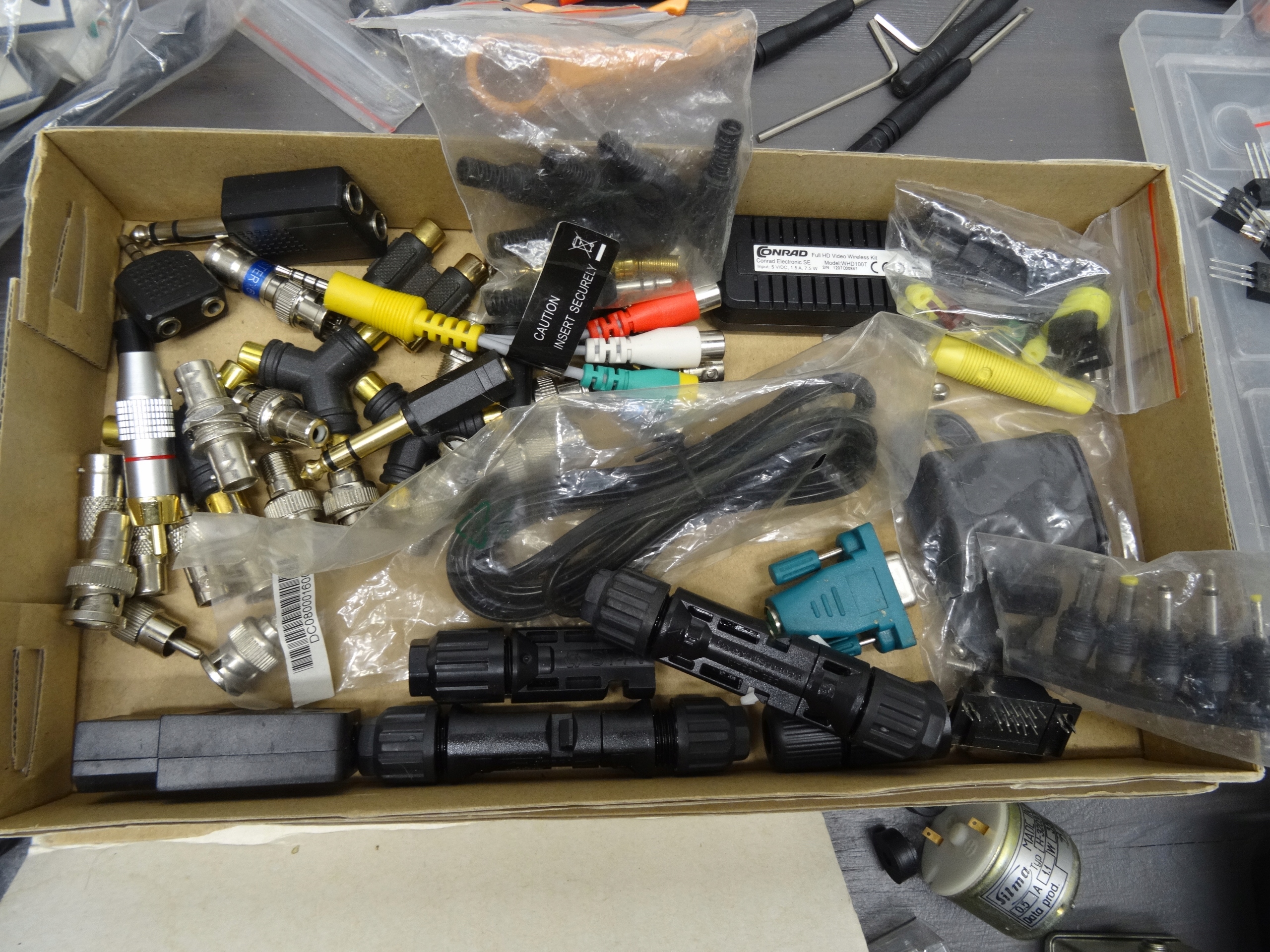 Дуже великий набір різноманітних електронних та електричних частин. В основному невикористані речі. Все запаковано в три валізи-органайзери та картонні коробки. Багато елементів повторюються, наприклад, різні вилки та резистори. Всього кілька сотень елементів.