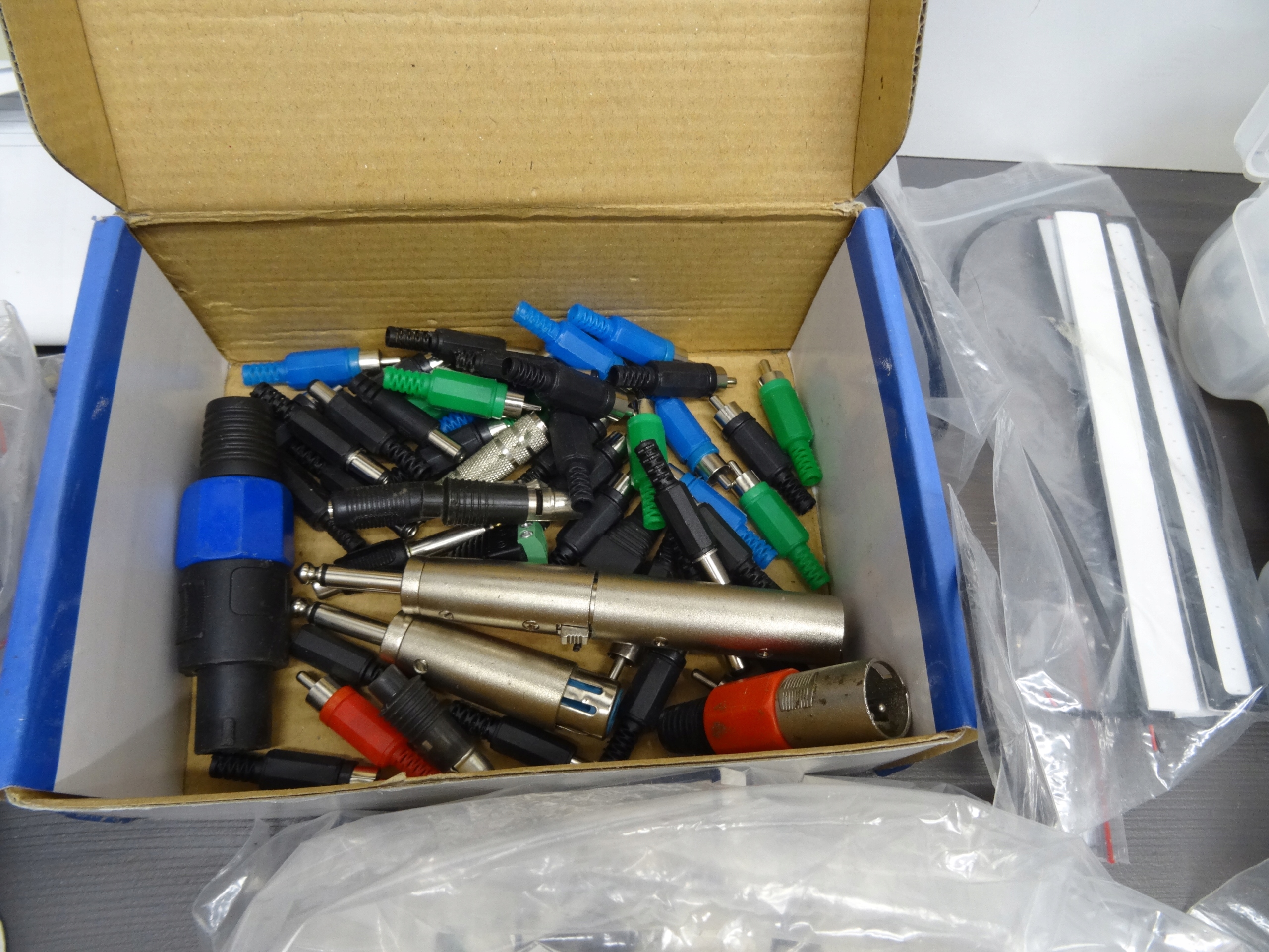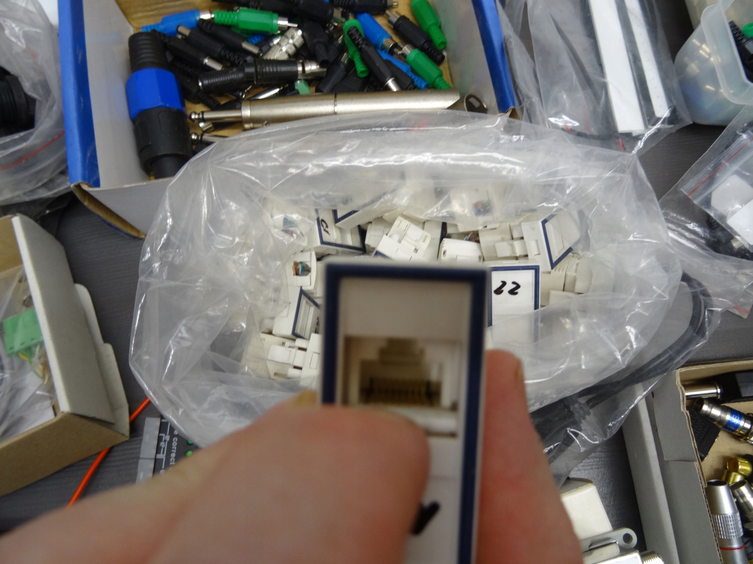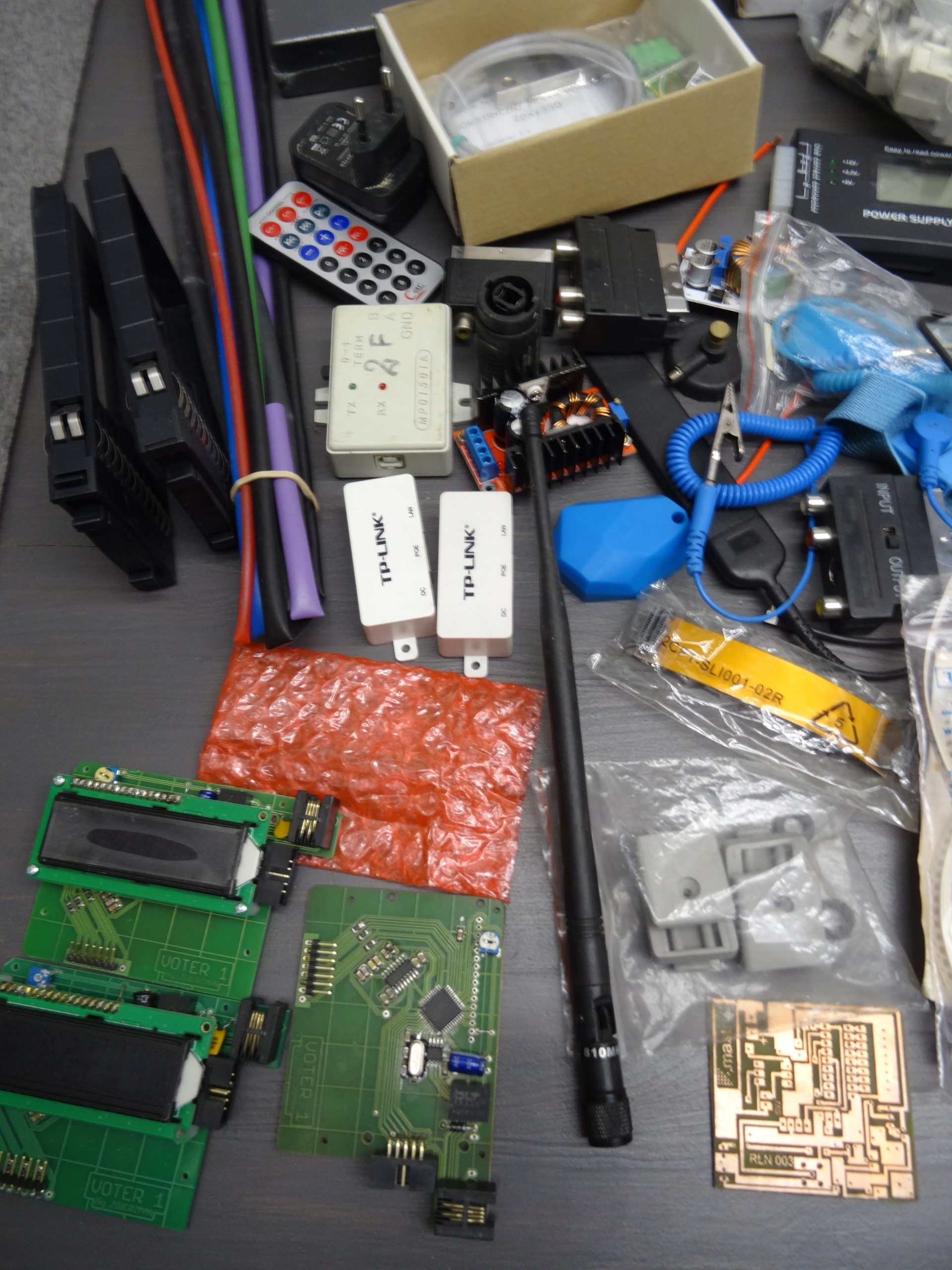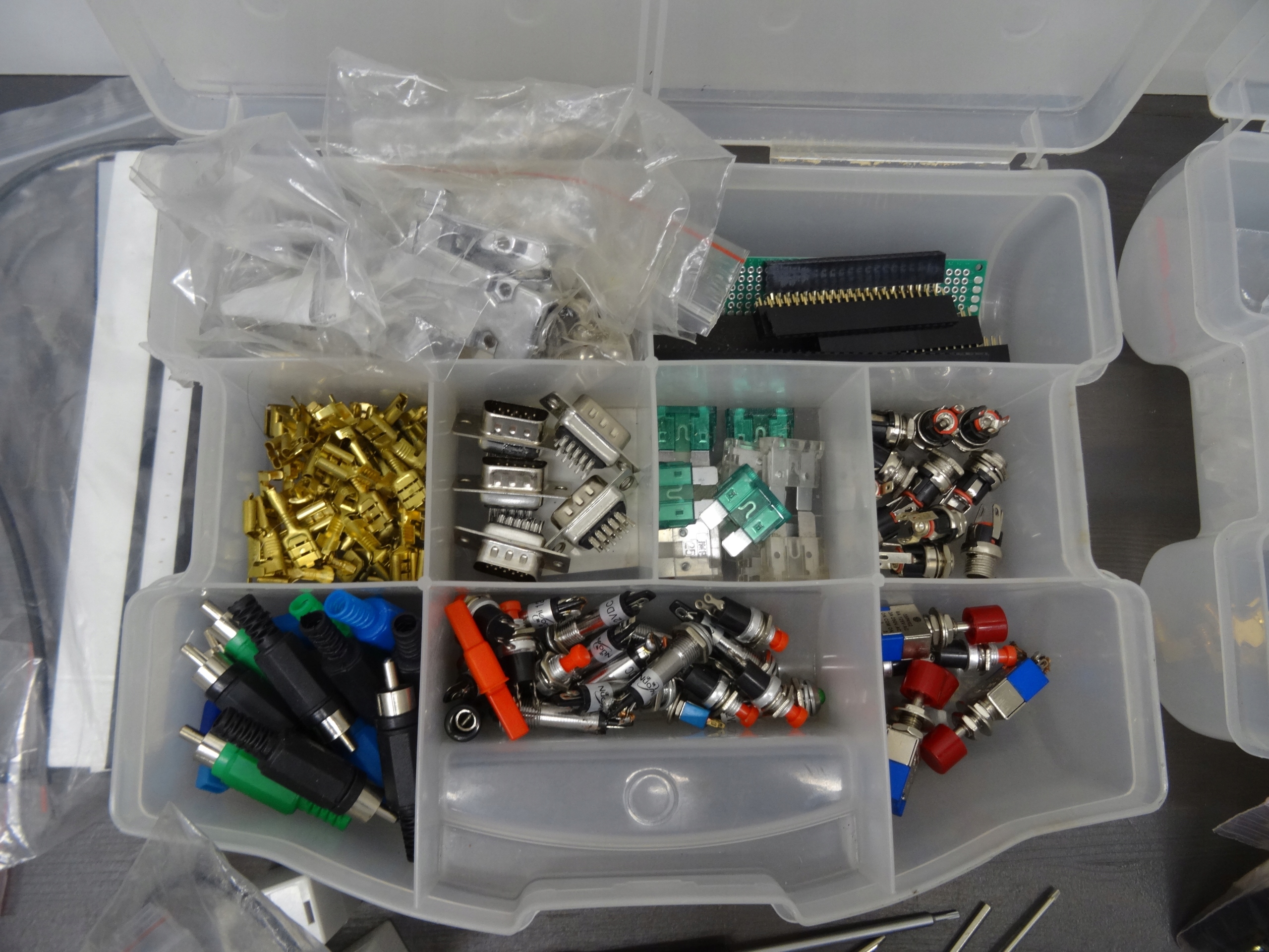 Дуже великий набір різноманітних електронних та електричних частин. В основному невикористані речі. Все запаковано в три валізи-органайзери та картонні коробки. Багато елементів повторюються, наприклад, різні вилки та резистори. Всього кілька сотень елементів.
