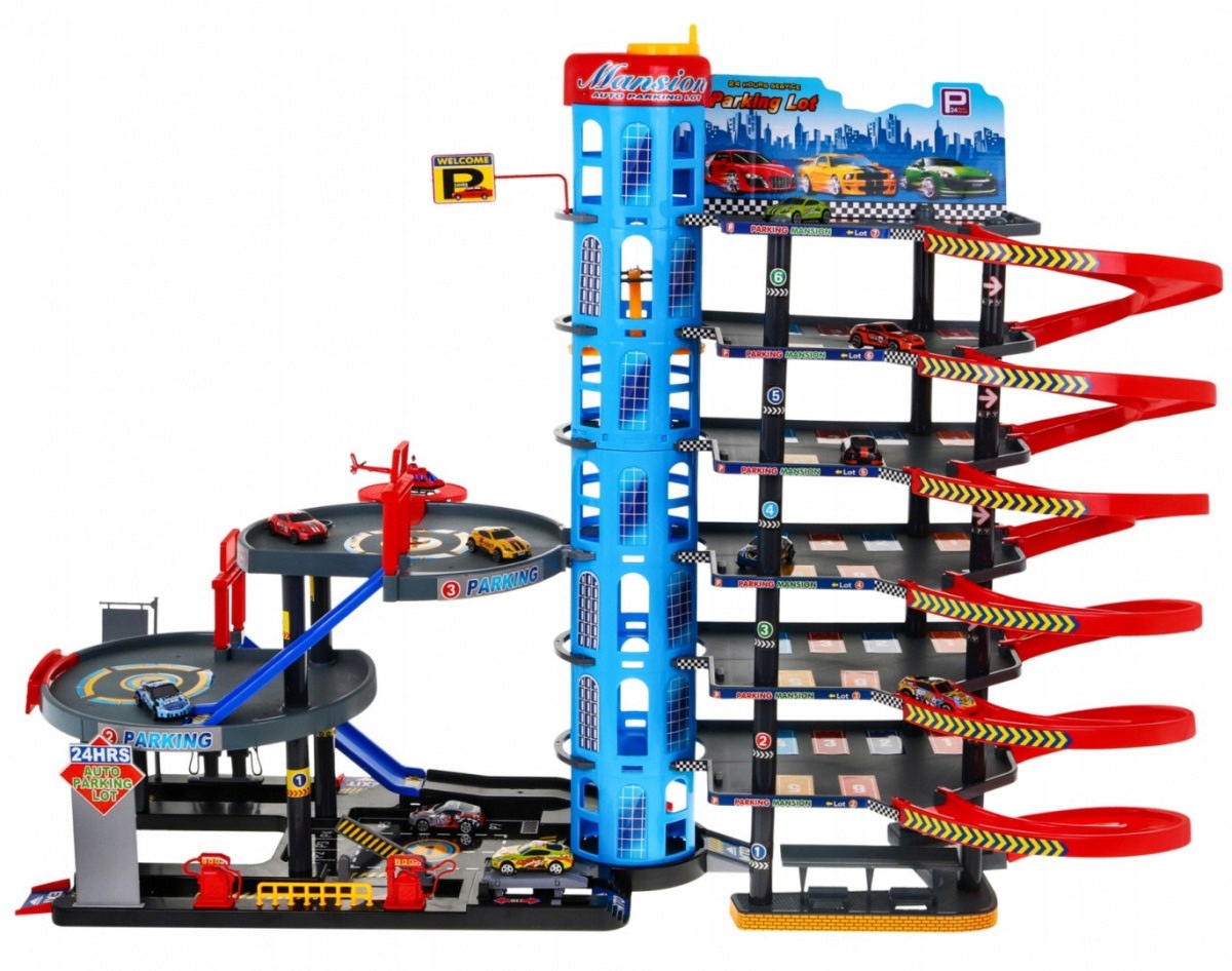 Велика 7-рівнева парковка для автомобілів з транспортними засобами, що входять в комплект, підходить для дітей від 3 років років . На наступні рівні паркінгу можна піднятися на ліфті або гірці. Іграшка не вимагає використання батарейок.