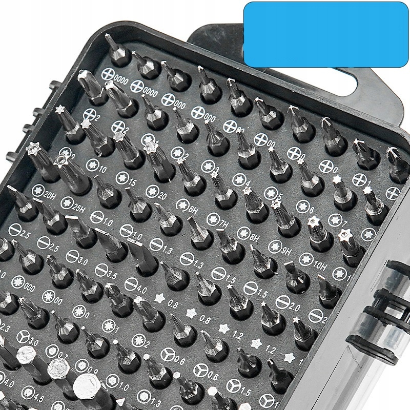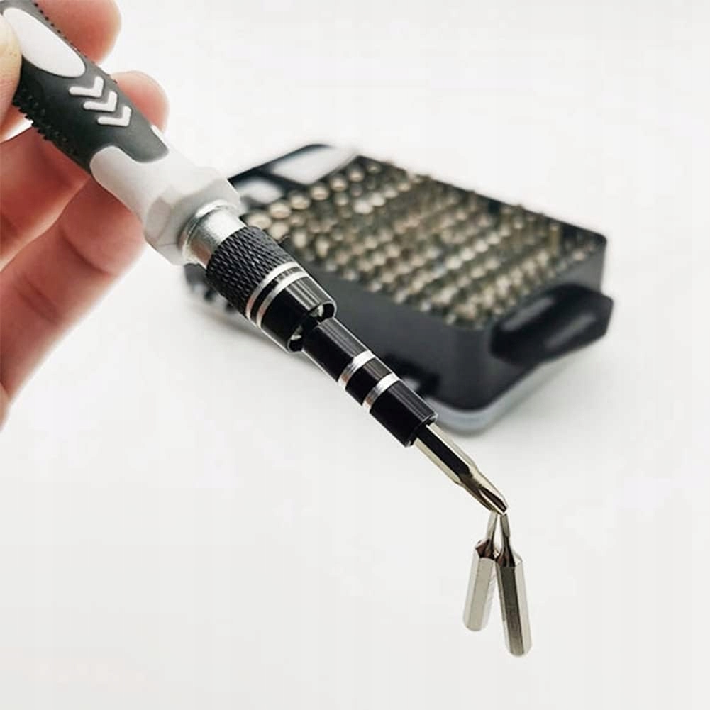 Набір оснащений цілих 115 елементами, що дозволить виконувати професійний ремонт. У набір входять необхідні інструменти і велика кількість викруток, які допоможуть вам при саморобці. Набір складається з основного інструменту, тобто підставки для викрутки, і цілих 98 біт різних розмірів і форм. Аксесуар також включає в себе відкривачки футлярів, магнітізатор/розмагнічувач для розеток і багато інших аксесуарів.