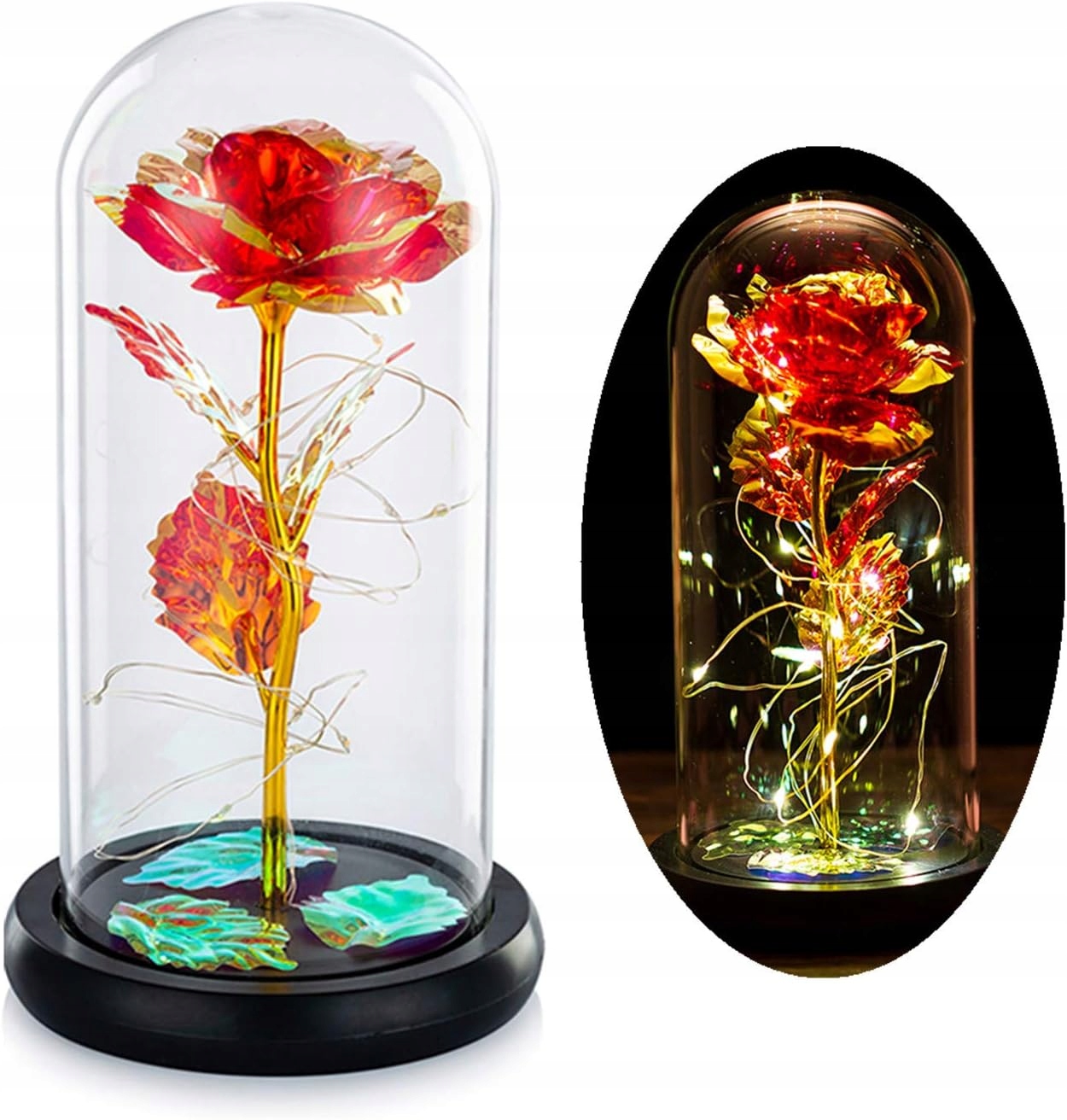 Виготовлена з високоякісної металевої фольги, троянда та пелюстки виглядають справжніми та мають унікальний смак краси, навіть якщо це штучна квітка. Цвіт троянди, покритий знімним прозорим скляним куполом, надійно захищений назавжди.