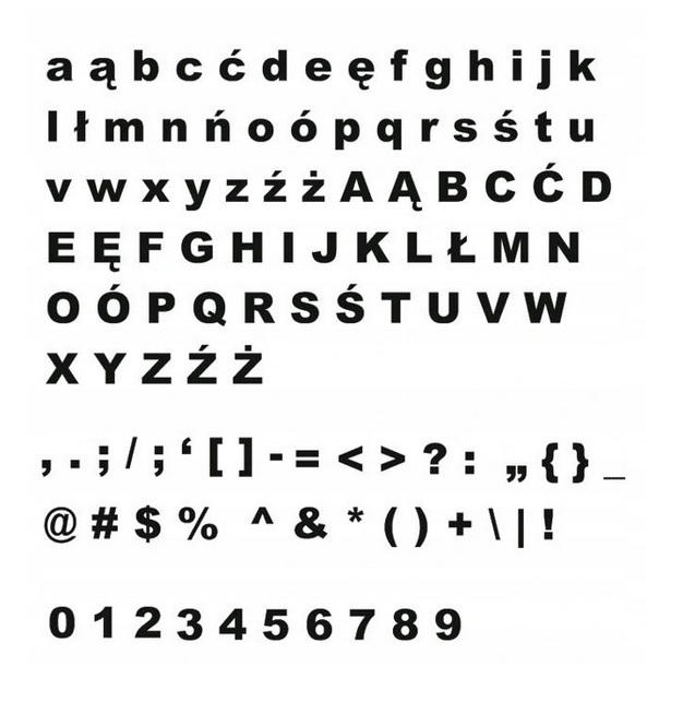 Висота, виміряна для A - доступні літери, знаки та пропорційні цифри відповідно до шаблону шрифту, представленого нижче - шрифт Ariel Black (щільний).