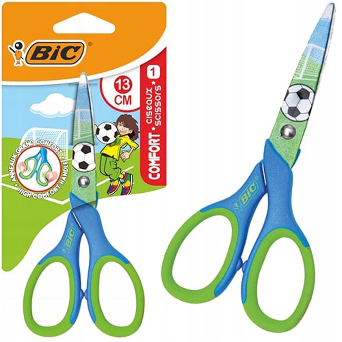 - 1x гумові шкільні ножиці, безпечні для дітей, комфорт BIC, 13 см, футбольний мотив