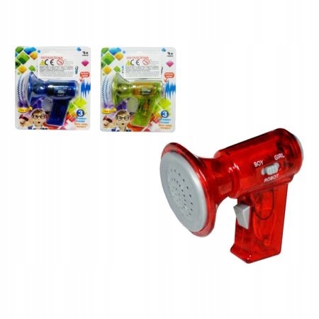 Це дуже гарний, компактний конвертер голосу, який зручно тримати в руці. Просто натисніть на курок, щоб увімкнути його, а потім говоріть у мікрофон. Це посилить ваш голос, і ви зможете змінити його незалежно від того, як звучить ваш справжній голос. Виготовлена з екологічно чистого пластику, безпечного і нетоксичного. Ви можете вибрати голос дівчинки, хлопчика чи робота