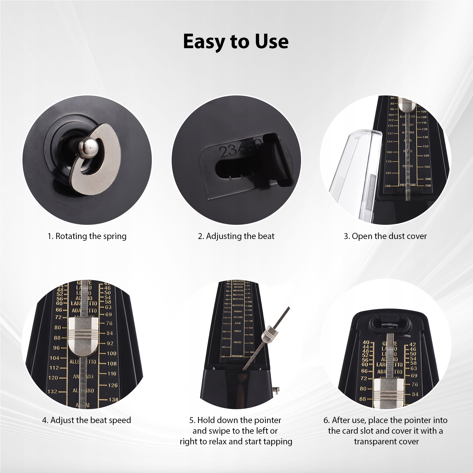 1. 【Стильний і міцний】: цей механічний метроном має стильний і витончений вигляд, який точно вразить. Виготовлений із металевого механізму, він забезпечує довший термін служби та більшу точність ритму, що робить його надійним інструментом для всіх музикантів.