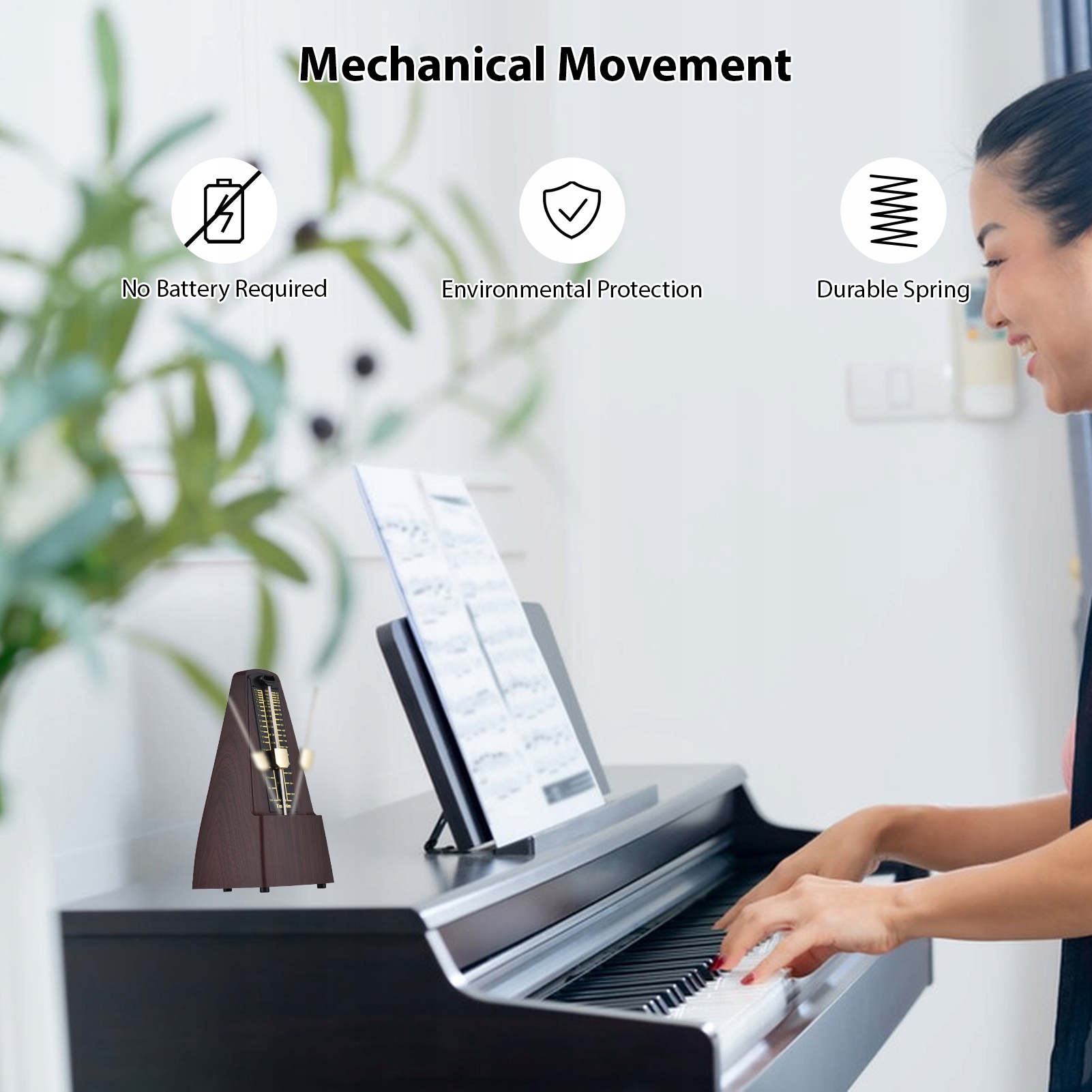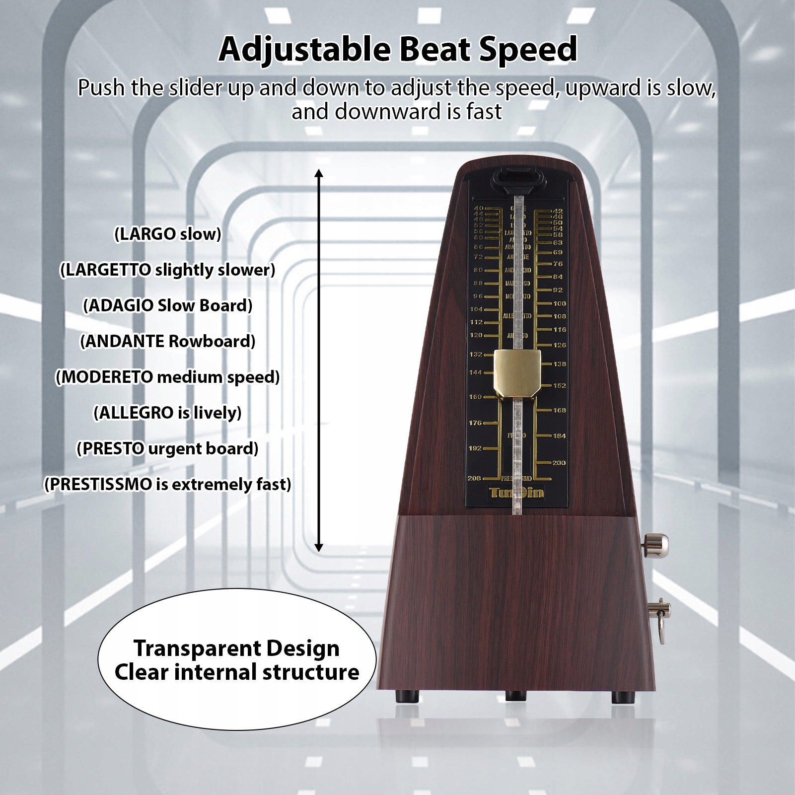 1. 【Точне керування темпом】: наш металевий механічний метроном розроблено для забезпечення точного та регульованого темпу для музикантів, які грають на різноманітних інструментах, таких як фортепіано, гітара, барабани та старовинна цитра. Завдяки чітким позначенням шкали та зручним металевим ручкам ви можете легко встановити бажаний темп і розвивати сильне почуття ритму.
