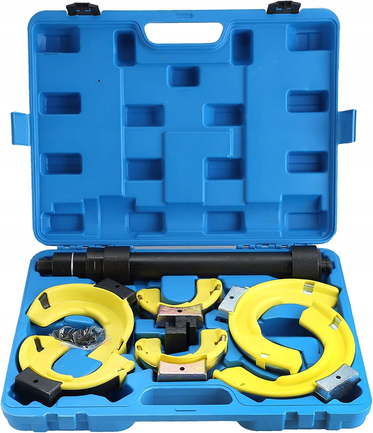 Професійний набір для зняття пружин в легкових автомобілях і мікроавтобусах. Наш набір цінується за універсальність - його можна використовувати в багатьох автомобілях. Всі елементи набору виготовлені з дуже міцної товстої сталі, яка витримує високі зусилля стиску. Перевагою знімачів цього типу є висока сила стиснення, розподілена по великій поверхні, що дозволяє уникнути пошкодження пружин і ризику поломки знімача. Затискачі мають кришки, які захищають пружину від подряпин. Крім того, знімач можна використовувати, не знімаючи колону. Наш набір цінується за універсальність і підходить для більшості колонок в легкових автомобілях і мікроавтобусах. Додатково в комплект входить адаптер, який дозволяє працювати з різними видами прогресивних пружин. Завдяки адаптеру набір можна використовувати не тільки для звичайних пружин, а й для конічних.