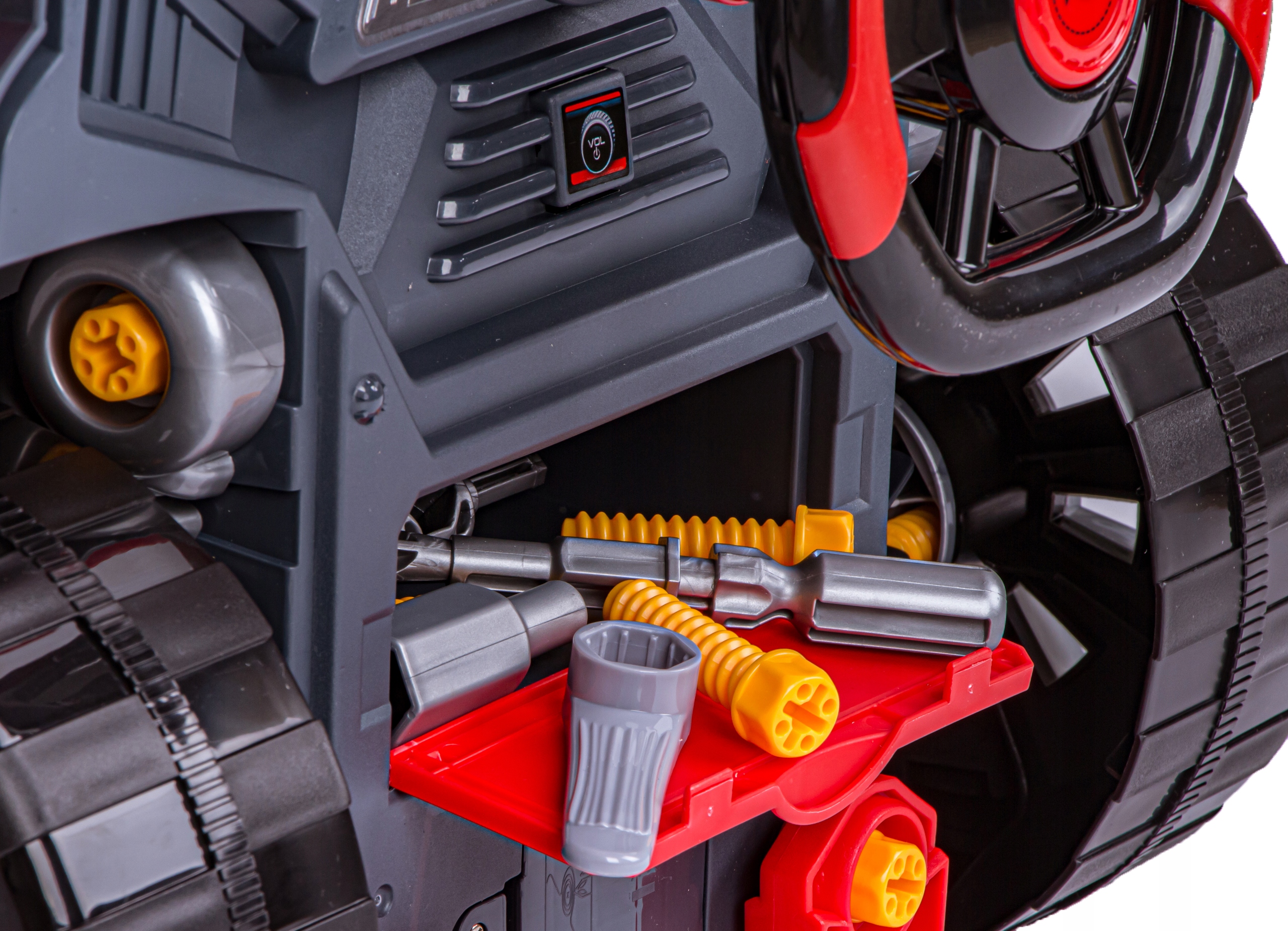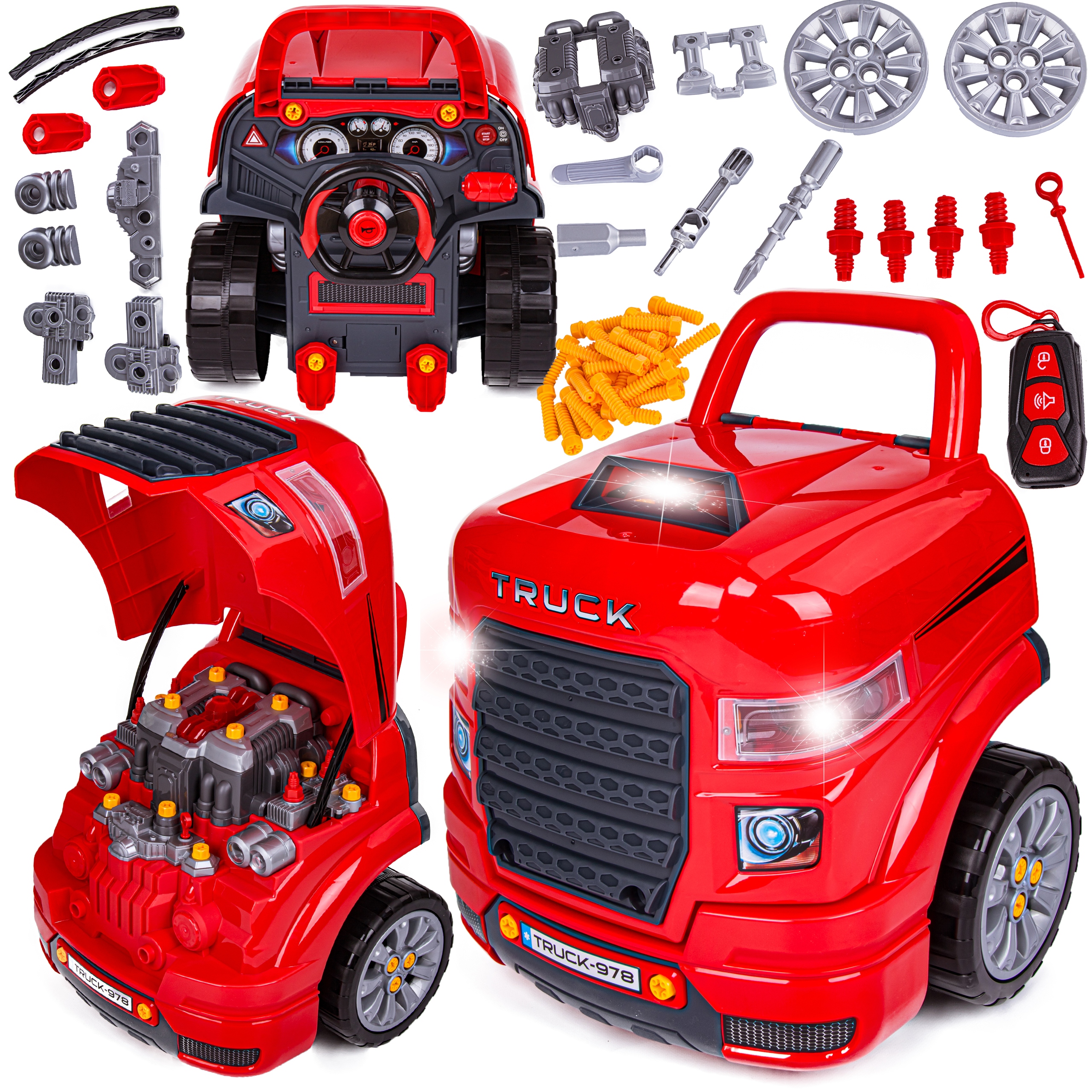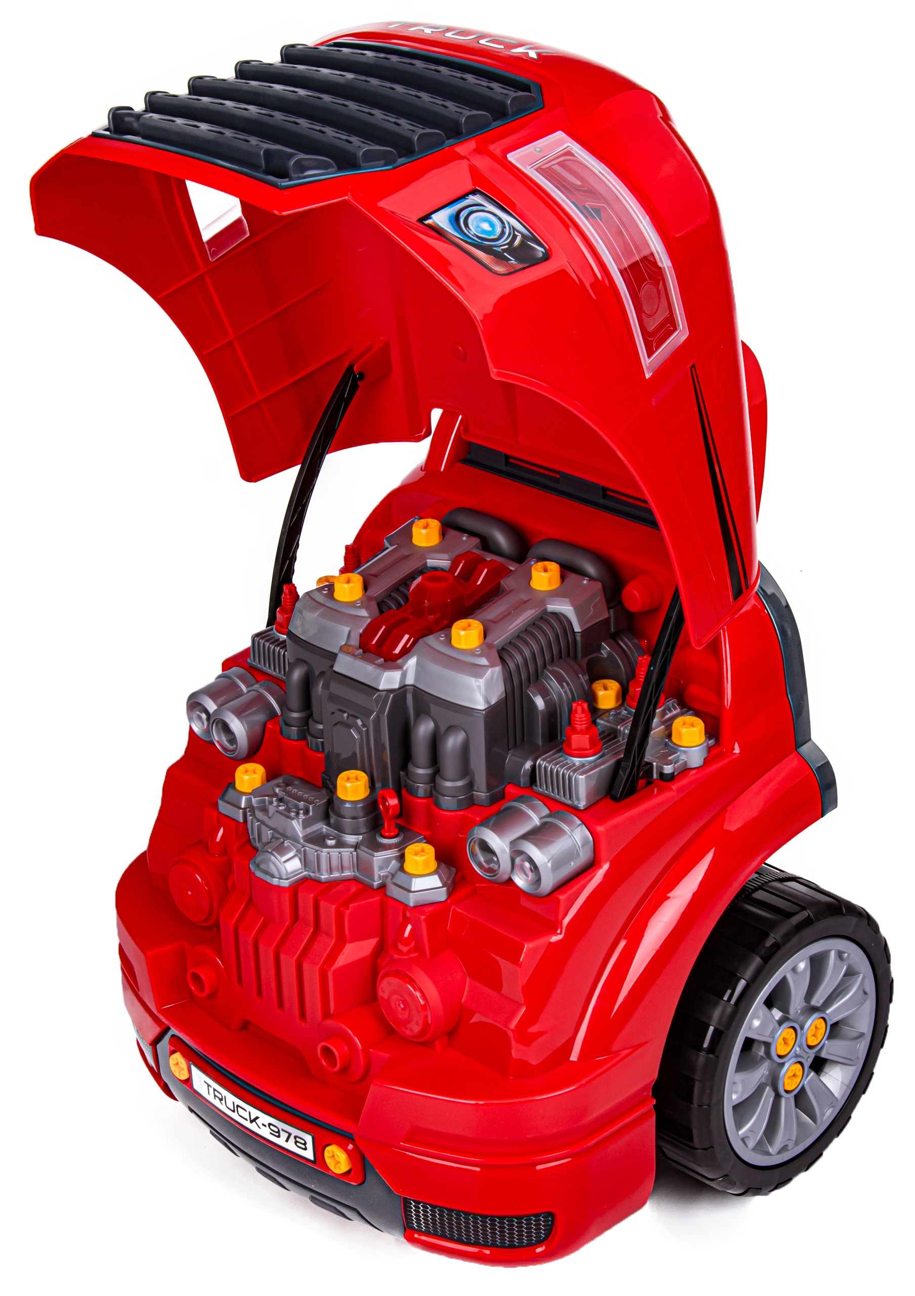 Після того, як розвага закінчиться, інструменти можна заховати в бардачок, а весь набір можна транспортувати куди завгодно. Це не буде проблемою завдяки поворотним колесам і ручці у вигляді рамки лобового скла. Все це означає, що ми можемо тягнути вантажівку, як коляску :)