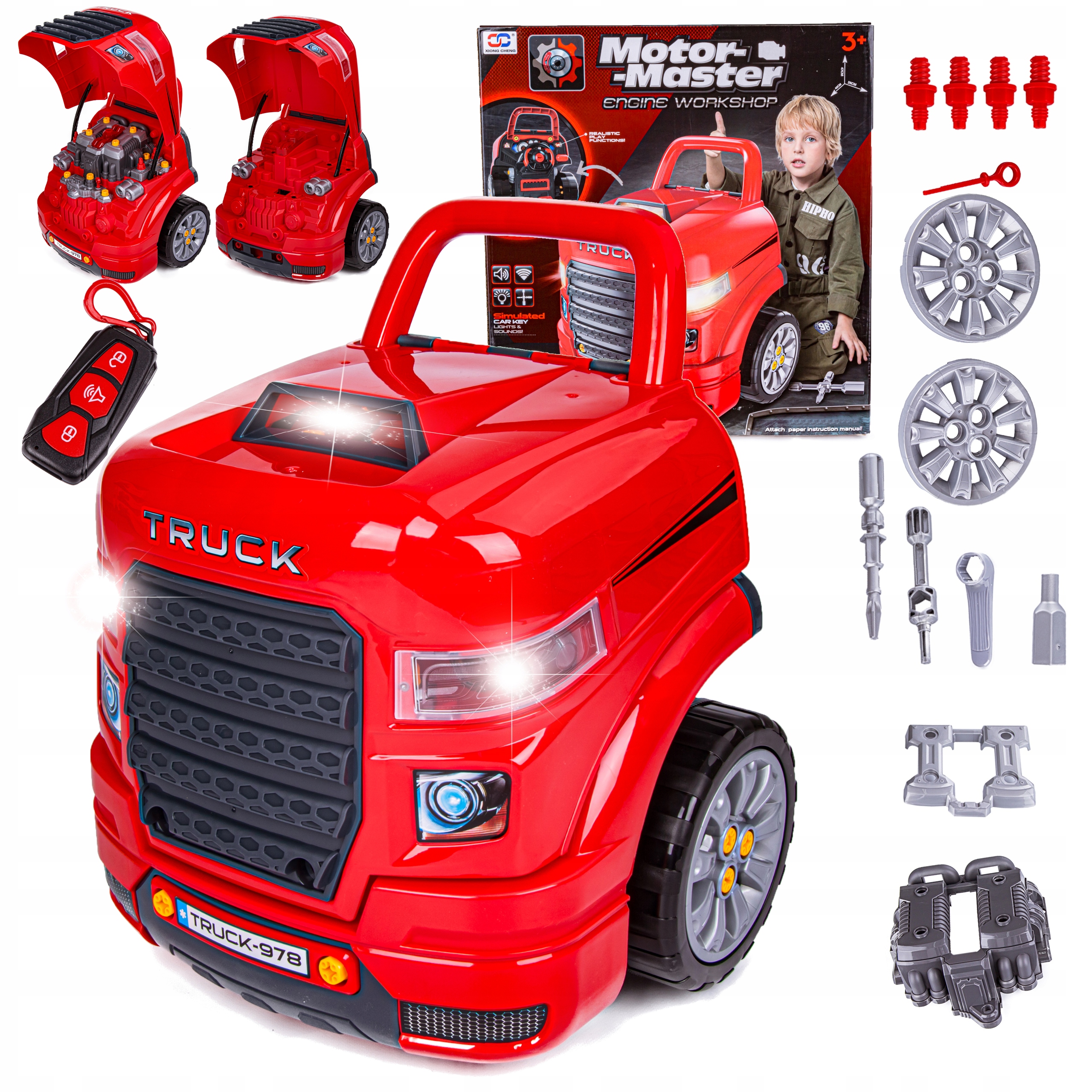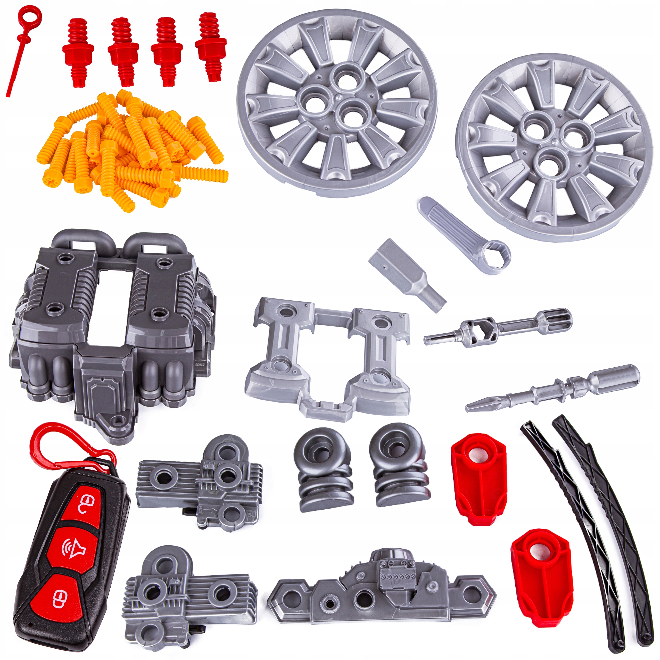 Позашляховик у розібраному вигляді є ідеальною іграшкою для маленьких любителів саморобки. У набір входить багато частин, серед яких: колеса, диски, компоненти двигуна, гвинти. Дитина може вільно крутити та відкручувати їх, щоб переконатися, що двигун автомобіля працює належним чином.