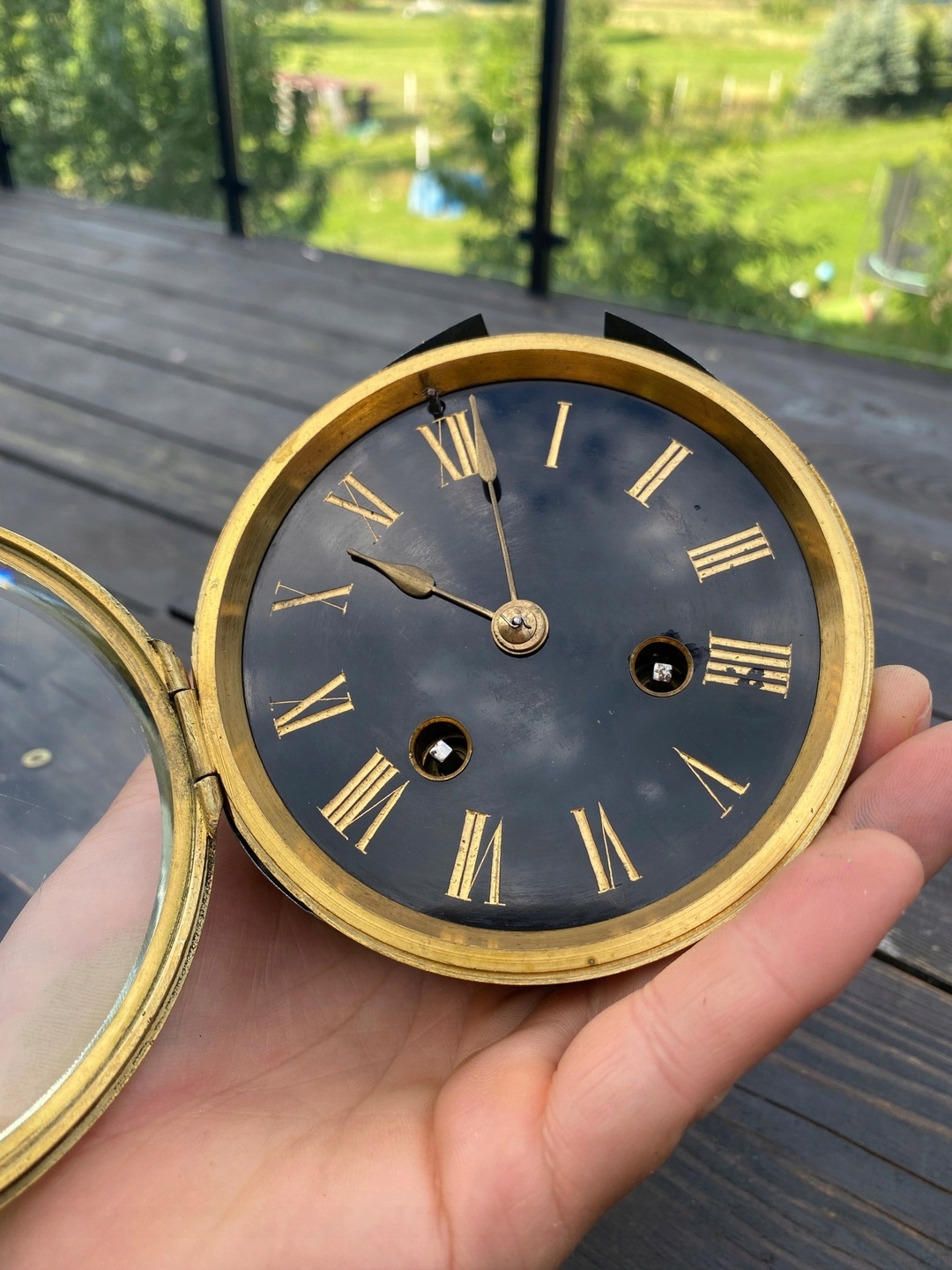 Циферблат механізму з чорного мармуру, в хорошому стані. - видимий дефект на 4 годині та на заводному механізмі.