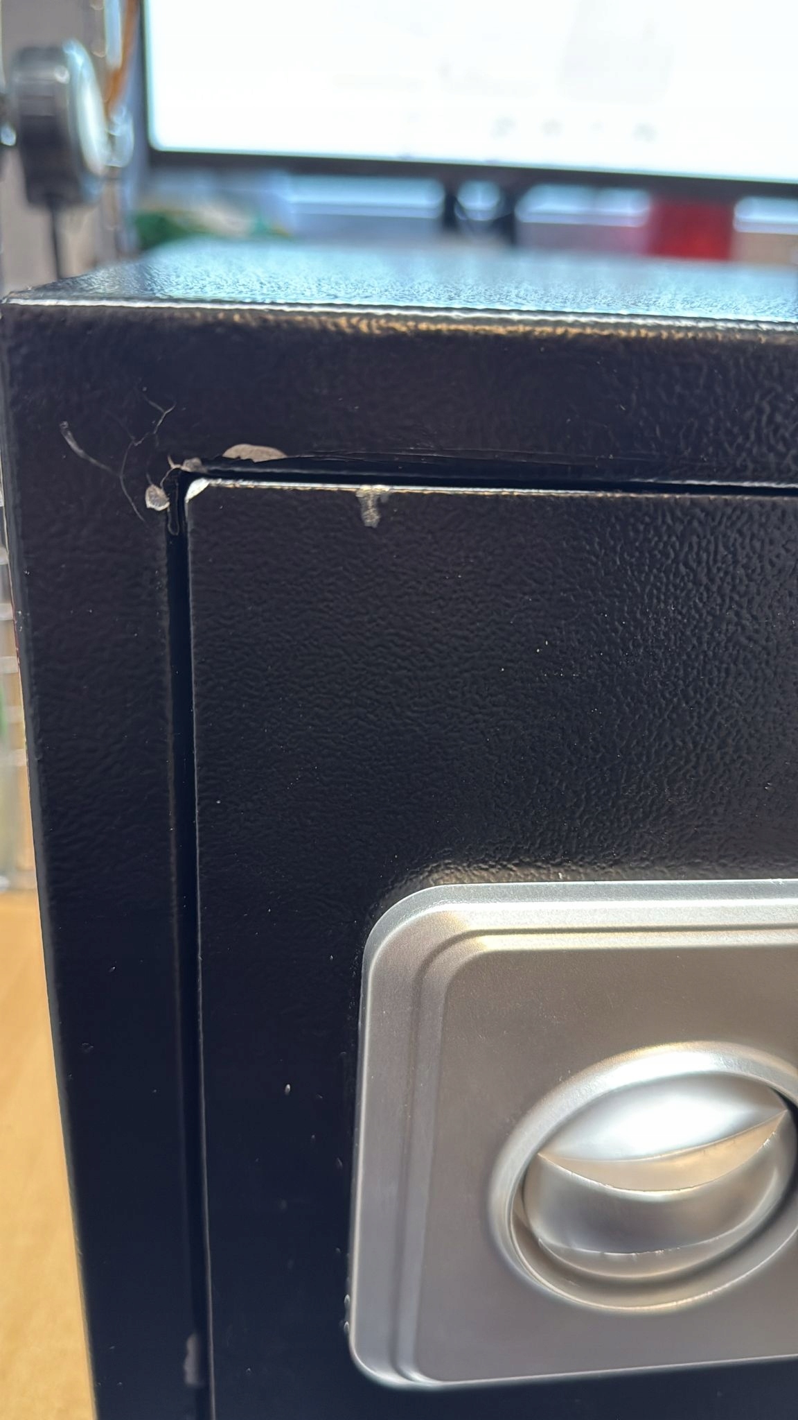 Сейф вимагає виправлень лаку, недоліки, показані на знімках, сейф не встановлювались, обидва клавіші в наборі, електроніка працює. Ключова пробка має зламану засувку.