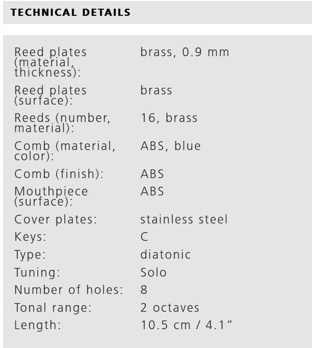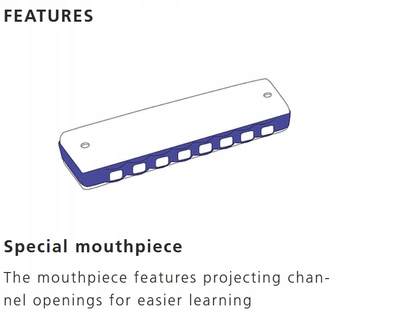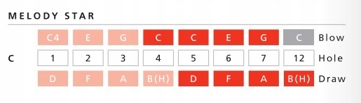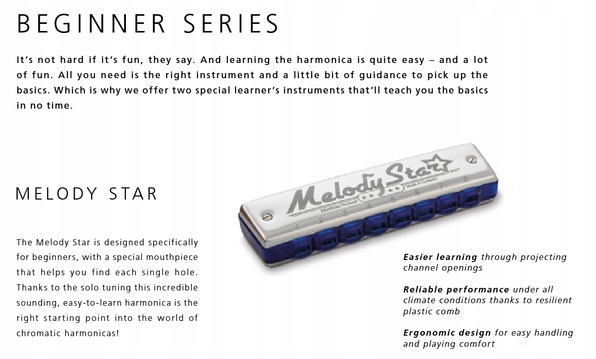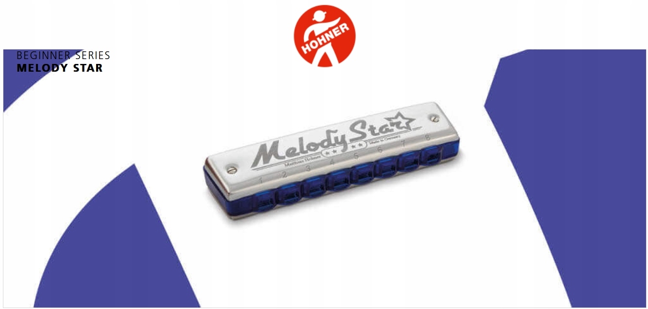 Melody Star була розроблена спеціально для початківців. Це гармоніка зі спеціальним мундштуком, який допомагає знайти кожну отвір. Підтримуючи відтворення індивідуальних звуків, це неймовірно гарне рішення навчитися грати в гармоніці. Це чудовий початок увійти у світ діатонічних та хроматичних гармоній!