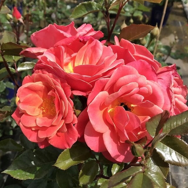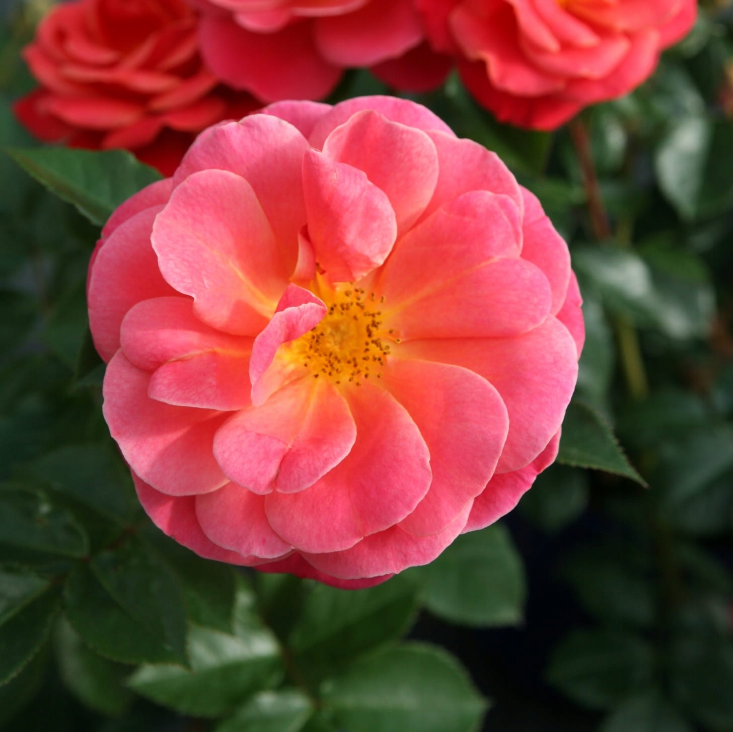Помаранчевий колір поступово переходить в рожевий, а темно-зелене, блискуче листя підсилює колір квіток, сильно контрастуючи з ними. Цвіте дуже рясно і повторює цвітіння до заморозків. Кущ неймовірної сили росту і пишного росту, кущистої форми, виростає до 90-100 см у висоту.