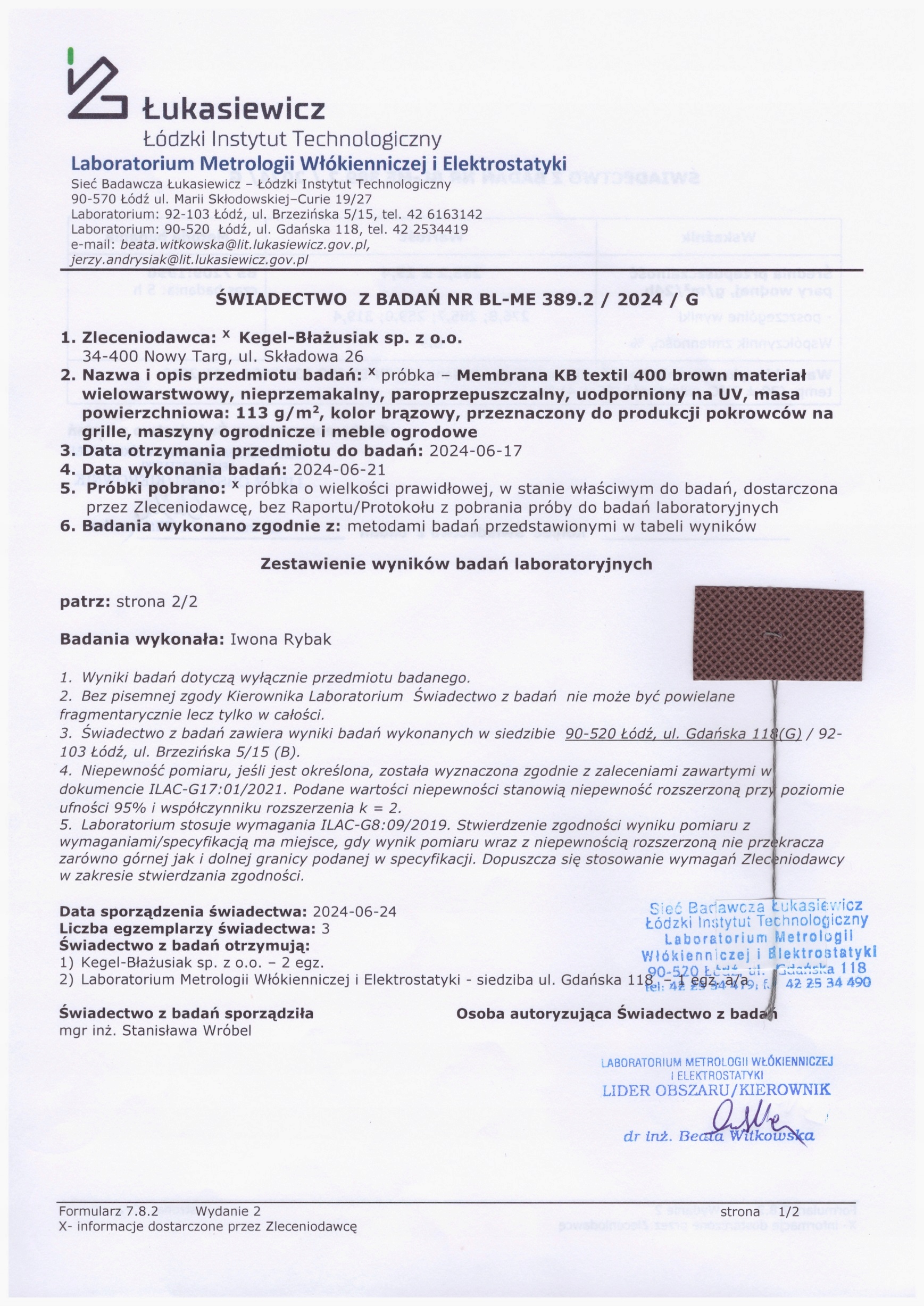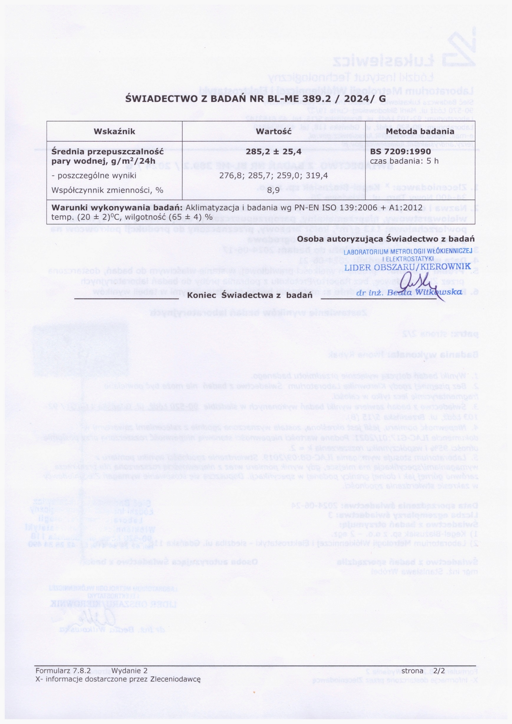 Нижче наведено звіт про випробування на паропроникність мембрани, з якої ми виготовляємо кришки Optimal Garage. Випробування проводилися в незалежній акредитованій дослідницькій лабораторії. Тест підтверджує високу паропроникність мембрани та проникнення водяної пари через покривну мембрану на рівні 285,2 грама водяної пари на м2 мембрани за 24 години.