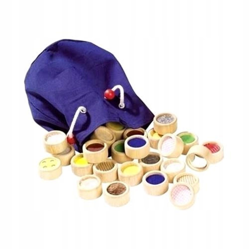 Незвичайний варіант мемо-гри зі знаходженням пар на дотик. Циліндричні блоки мають різні поверхні, які можна визначити пальцями. Гра відмінно розвиває дотик. У набір входить 16 пар дерев'яних брусків діаметром 4 см і бавовняний мішечок.