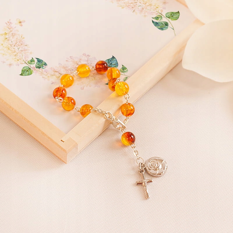 - Своєю чергою, в коробці буде подарунок у вигляді пам’ятної декади вервиці. Бурштинові намистини з’єднувалися срібним ланцюжком і завершувалися хрестом. Все витримано у флористичному стилі з рослинними мотивами - зелене листя та білі квіти надають подарунку класичного характеру. Універсальність такого подарунка означає, що його можна подарувати як дівчинці, так і хлопчику.