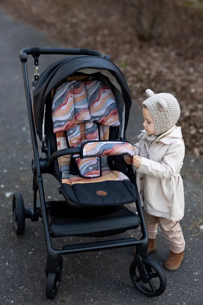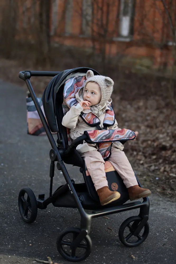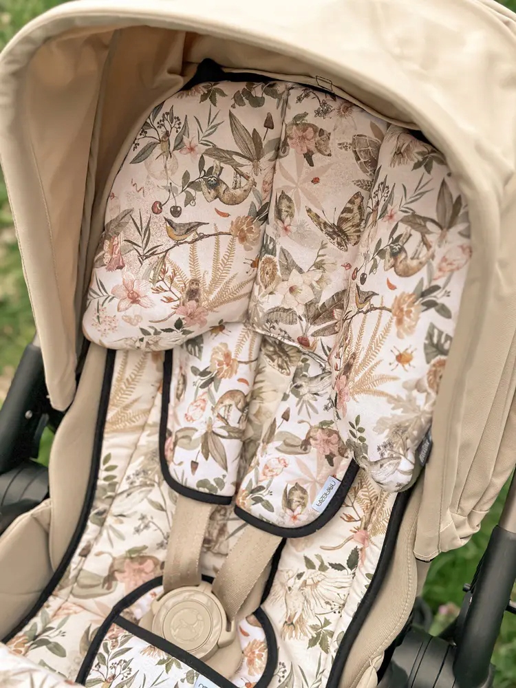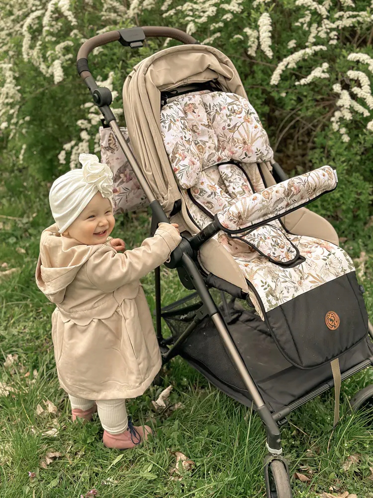 Вставка виготовлена з бавовни найвищої якості з оригінальним малюнком. Друга сторона виконана з повітряного бавовняного трикотажу. Додатково внизу вшита підніжка, яка захистить коляску від забруднення взуттям малюка. Вставка також має два довгих отвори для ременів і більший, посилений отвір для промежинного ременя. У верхній частині розташовані ремінці для кріплення до коляски, а ззаду широка гумка, застібається на липучку, яка додатково фіксує вкладиш.