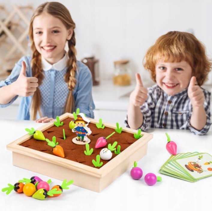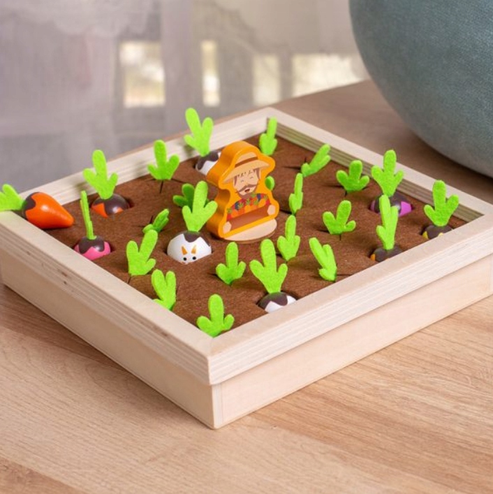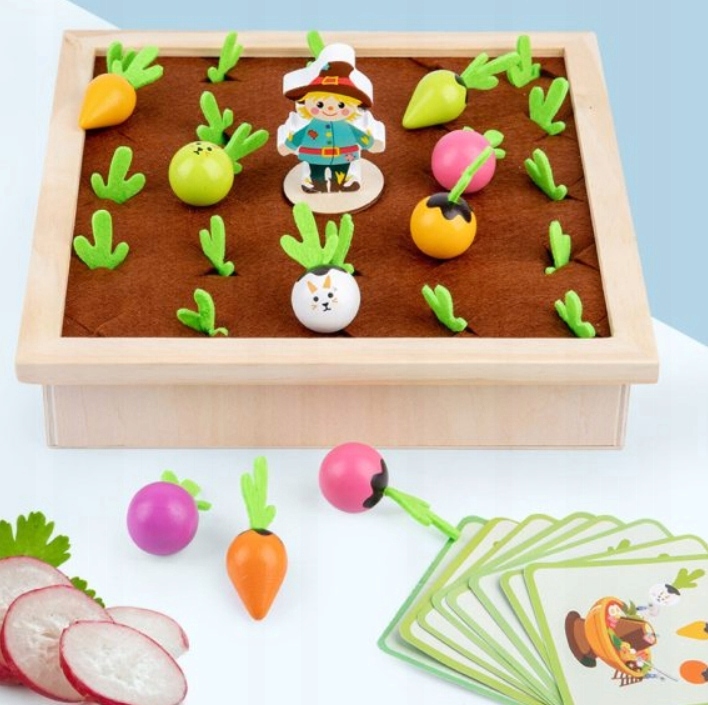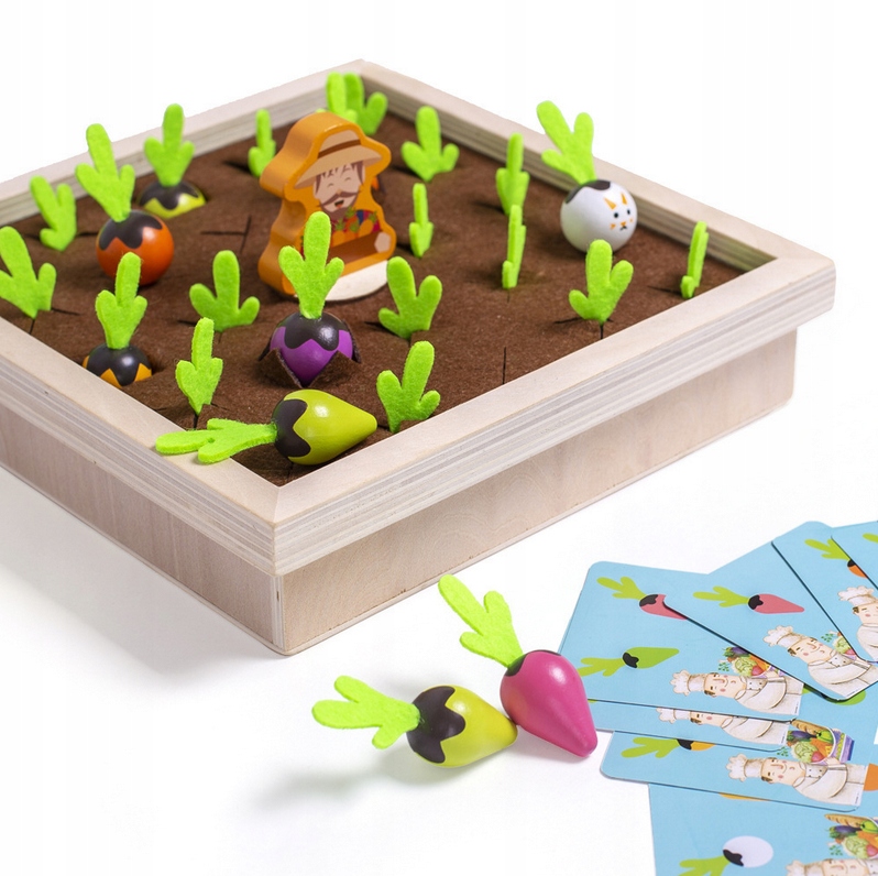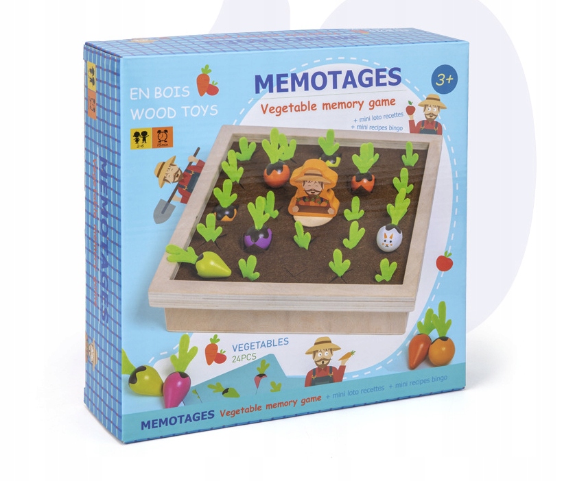 Дерев'яна гра на пам'ять MemoryFarm принесе багато радості вашій дитині. Гра складається з дерев'яного саду з «повстяним ґрунтом», в якому можна «посадити» овочі. Дитина запам'ятовує, де знаходяться окремі овочі. Потім він бере картки та намагається зібрати потрібні овочі з городу.