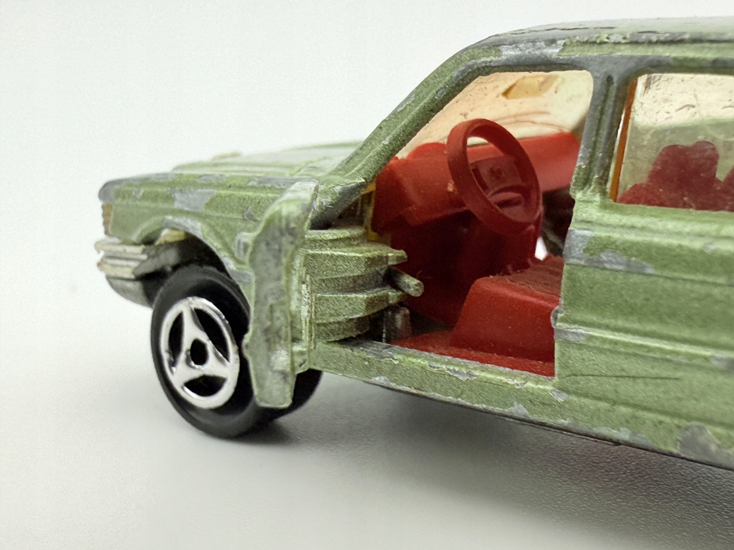 Ця весна показує модель Mercedes 450 SE, яка відрізняється зеленим тілом та червоним салоном. Набір також включає жовто-червоний трейлер, який надає йому унікального персонажа. Модель виготовлена з металу з додатковими пластиковими елементами, що робить його міцним і міцним. Відкриті двері підвищують свою привабливість для колекціонерів. Стан поведінки хороший, з видимими слідами використання, що свідчить про його історію. Це відмінна копія для любителів класичних моделей автомобілів.