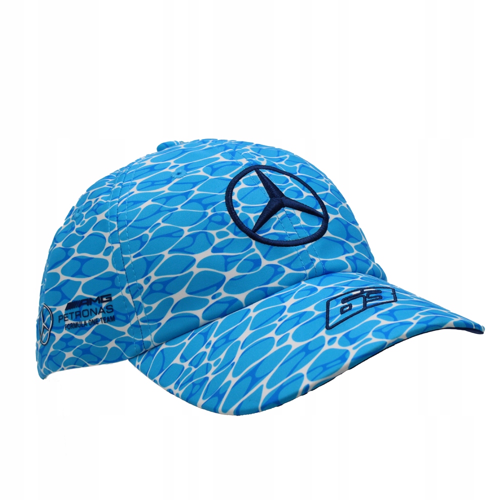 Кепка George Russell розроблена як бейсболка з 6 панелей і, окрім зірки Mercedes, також містить логотип команди Mercedes-AMG F1 Team, номер 63 Джорджа Рассела та інші логотипи партнерів.