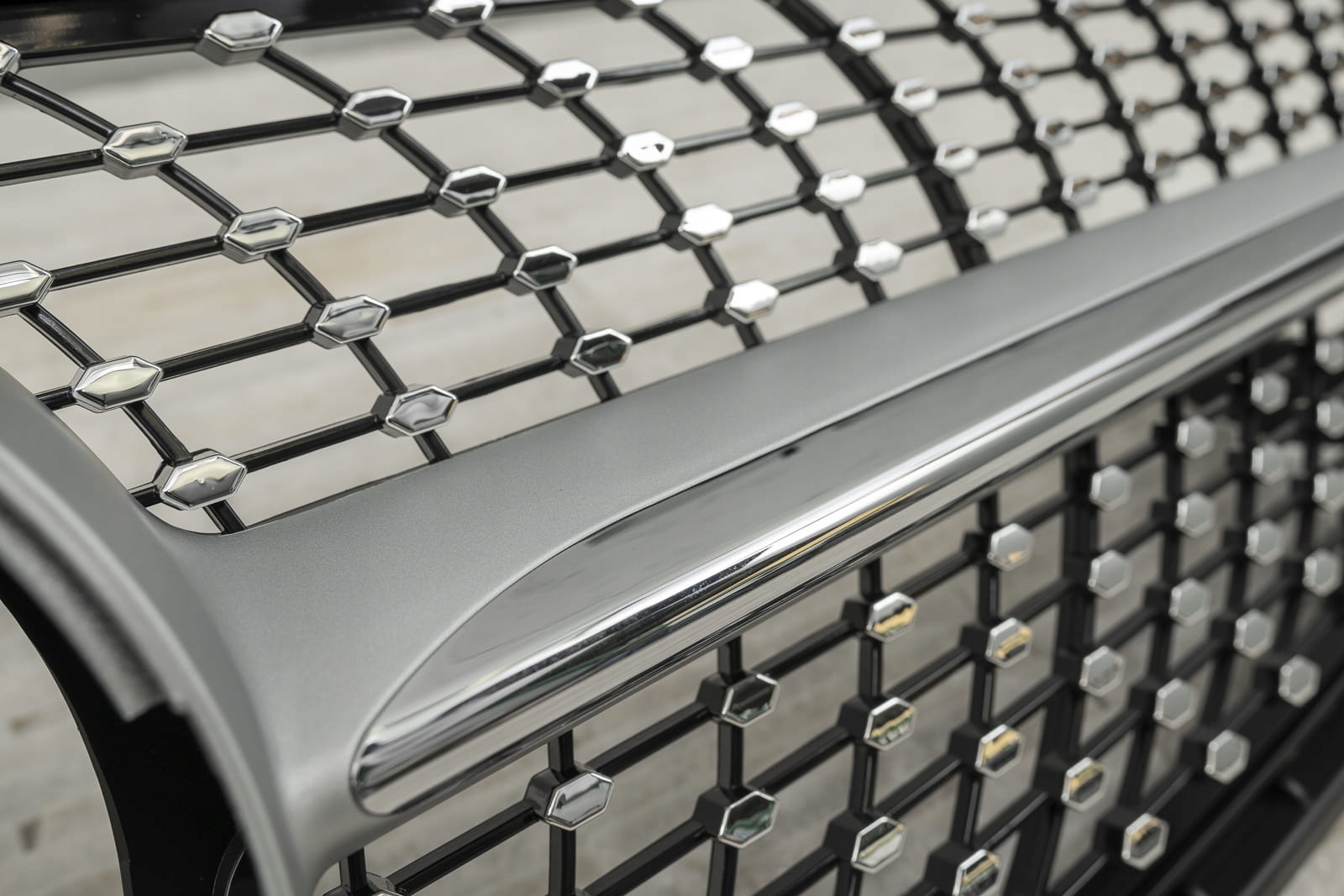 Спеціальна решітка була розроблена так, щоб ідеально відповідати дизайну решітки B-класу, прикрашена сріблястими штифтами, які радіально поширюються з обох сторін елемента, що надає йому вражаючого оригінального стилю, характерного для найрозкішніших моделей. Вони заповнюють простір навколо знака MERCEDES, оточуючи його елегантною рамкою. Решітка DIAMOND дозволяє створити модний, сучасний стиль вашого автомобіля, підвищивши його візуальні якості.