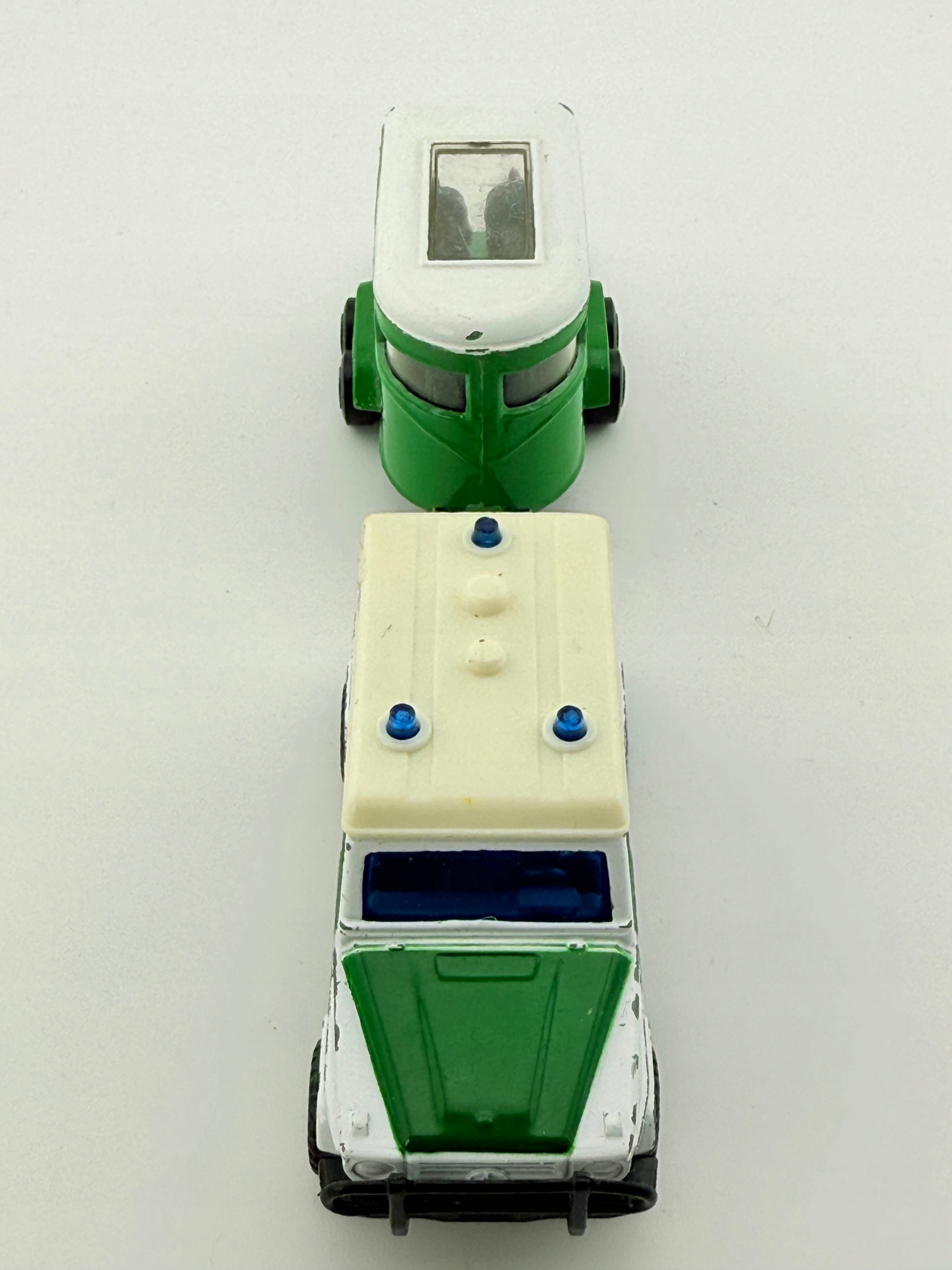 позначка: сірник • Модель: Mercedes-Benz 280 GE • Виробник: Mattel • Масштаб: 1:64 • Умова: Використовується • Матеріал: метал + пластик • Довжина (мм): 70 • Кольори: зелений та білий • Додавання: причіп, деталі поліції • Номер каталогу: Inmax • Зроблено в: Таїланді