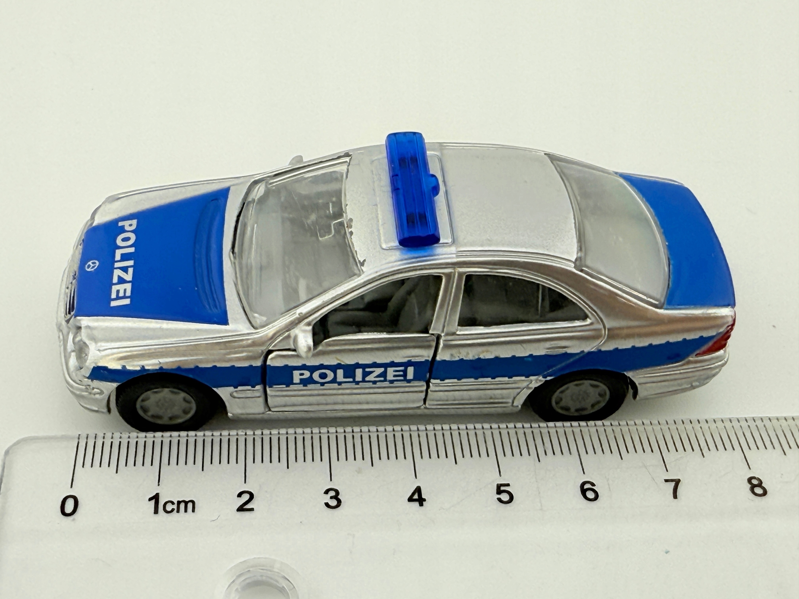 Бренд: Siku • Модель: Mercedes-Benz C320 • Виробник: Siku • Масштаб: 1:55 • Стан: б/в • Матеріал: метал + пластик • Довжина (мм): 75 • Колір: срібний з синіми акцентами • Додатково: двері, що відкриваються, синє світло на даху • Каталожний номер: 5706U