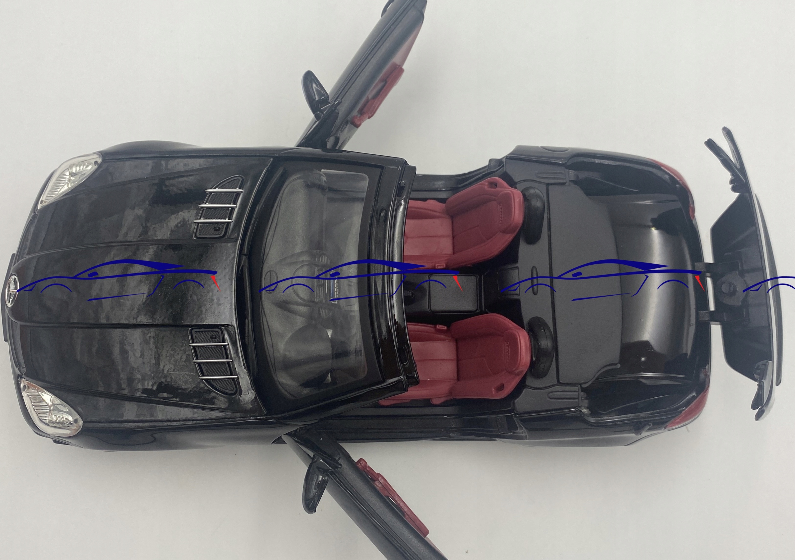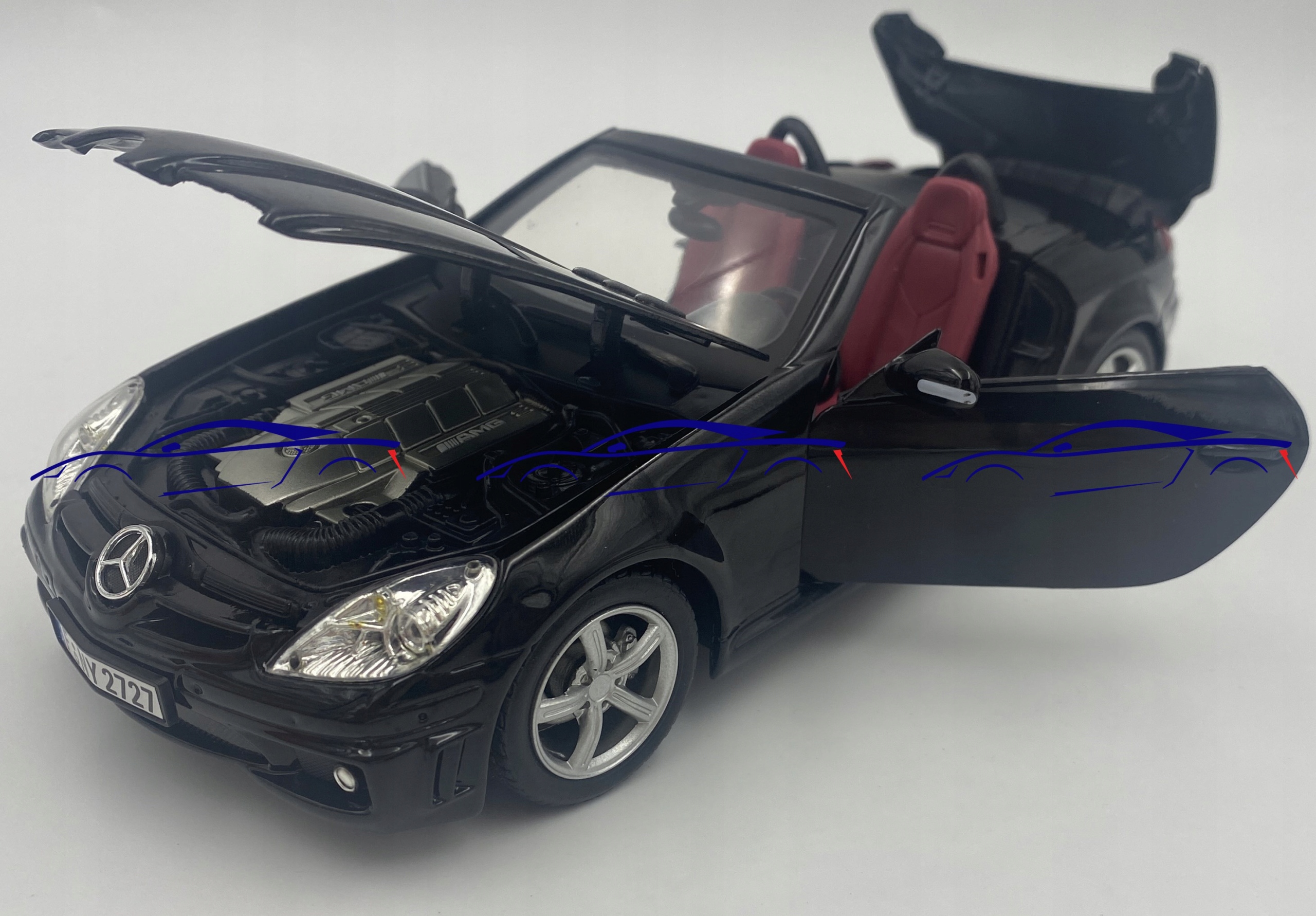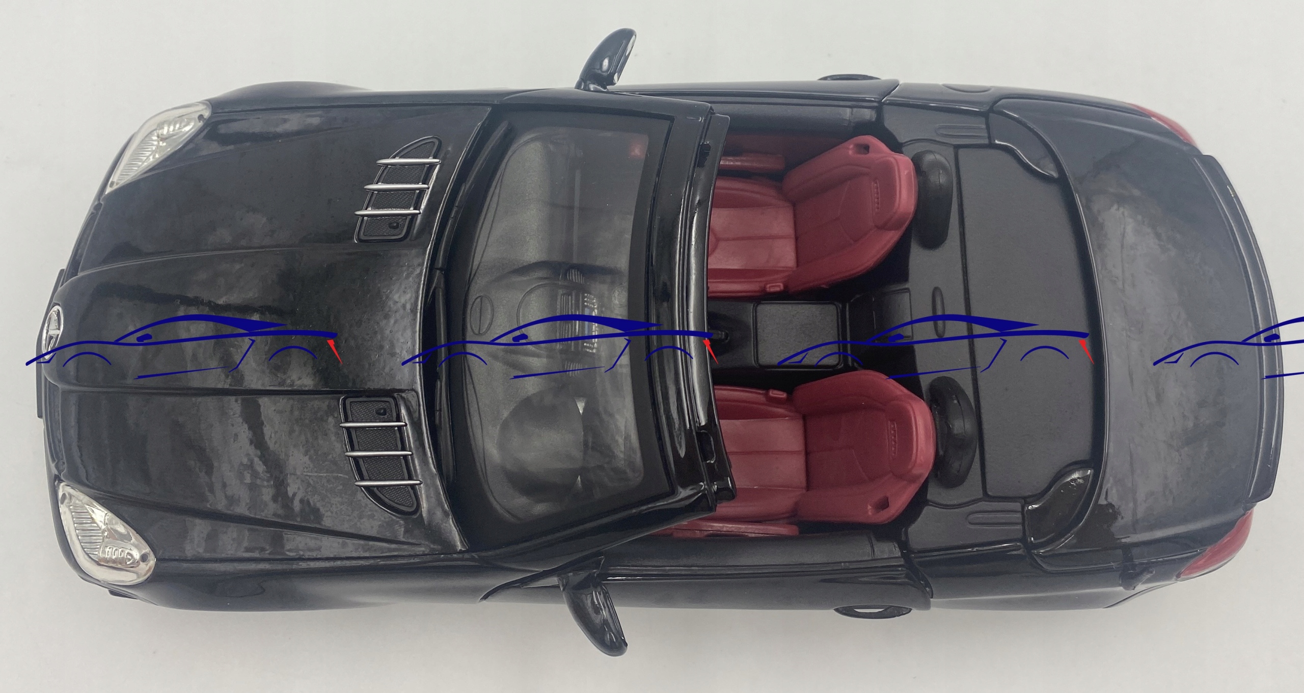 Модель автомобіля характеризується увагою до деталей. Має рухомі елементи - двері, кришку двигуна і дах.