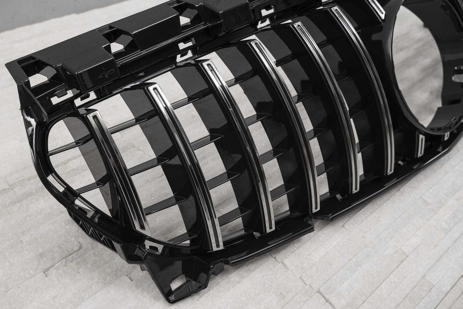 Спеціальна решітка розроблена в стилі, типовому для автомобілів сегменту GT. Решітка радіатора прикрашена широкими хромованими поперечинами, які неминуче нагадують про респектабельні, потужні автомобілі топ-полиці. Елемент вражає своїм спортивним характером, а глянець хромованих елементів додає елегантності - завдяки чому він ідеально поєднується з вражаючим дизайном Mercedes.