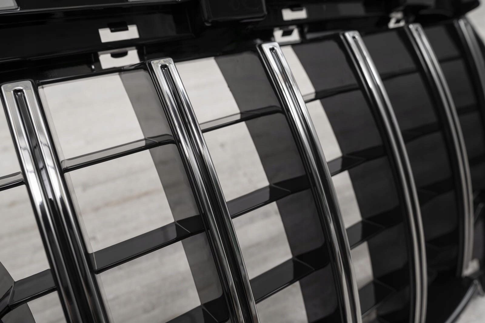 Окрема решітка розроблена в стилі, типовому для автомобілів сегменту GT. Решітка радіатора прикрашена широкими хромованими поперечинами, які неминуче нагадують про респектабельні, потужні автомобілі топ-полиці. Елемент вражає своїм спортивним характером, а глянець хромованих елементів додає елегантності - завдяки чому він ідеально поєднується з вражаючим дизайном Mercedes.