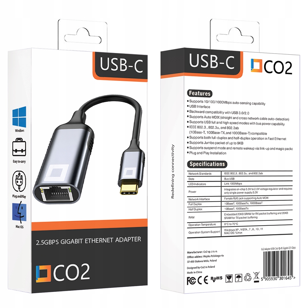 Відкрийте надійність з'єднання з адаптером Ethernet USB-C польської марки CO2. Цей компактний і стильний адаптер є ідеальним рішенням для людей, які потребують стабільного, швидкого Інтернету в будь -яких умовах. Завдяки підтримці швидкості для 2,5 гігабіти , ви можете легко проводити відео -конференції, надсилати великі файли або переглядати фільми у найвищій якості без перешкод та затримки. Суцільний алюмінієвий корпус забезпечує довговічність, а функція Plug & Play полегшує підключення та використання.